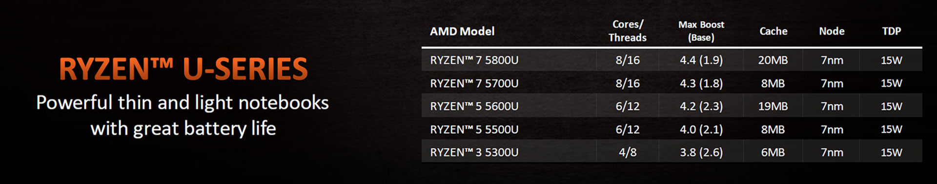 Ryzen 7 5700U | Ryzen 5 5600U | Ryzen 5 5500U | Ryzen 3 5400U | Ryzen 3 5300U | |