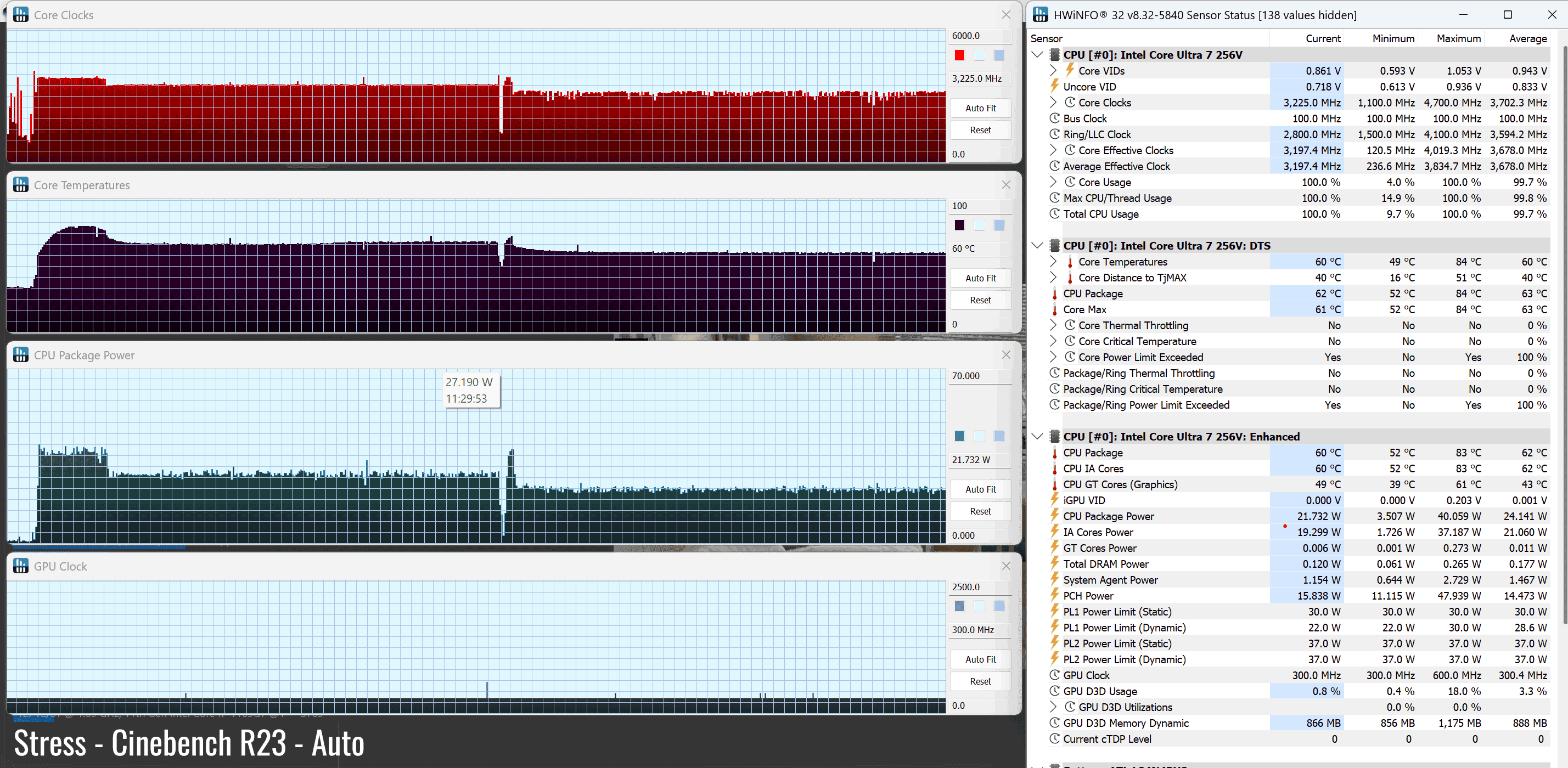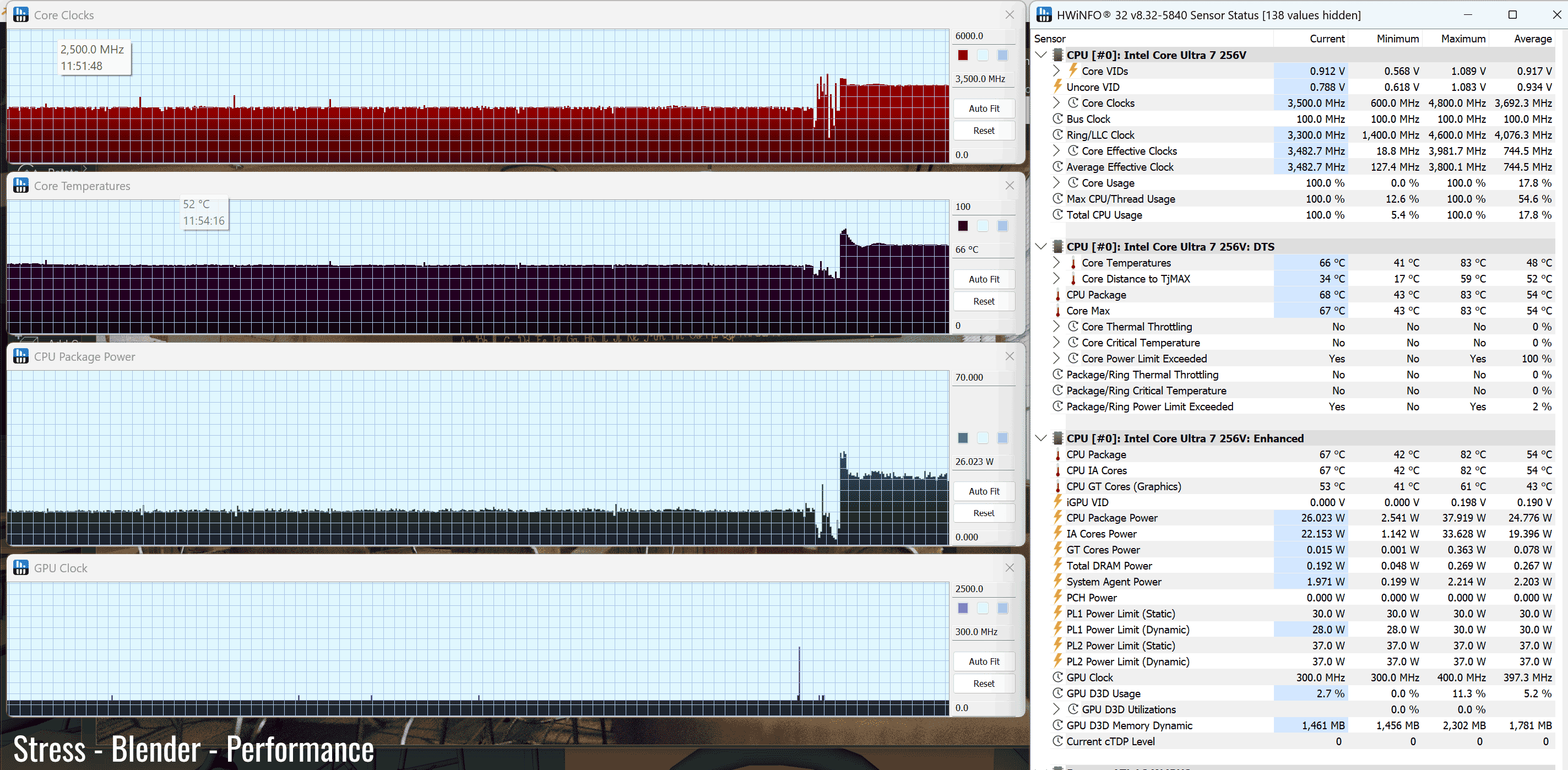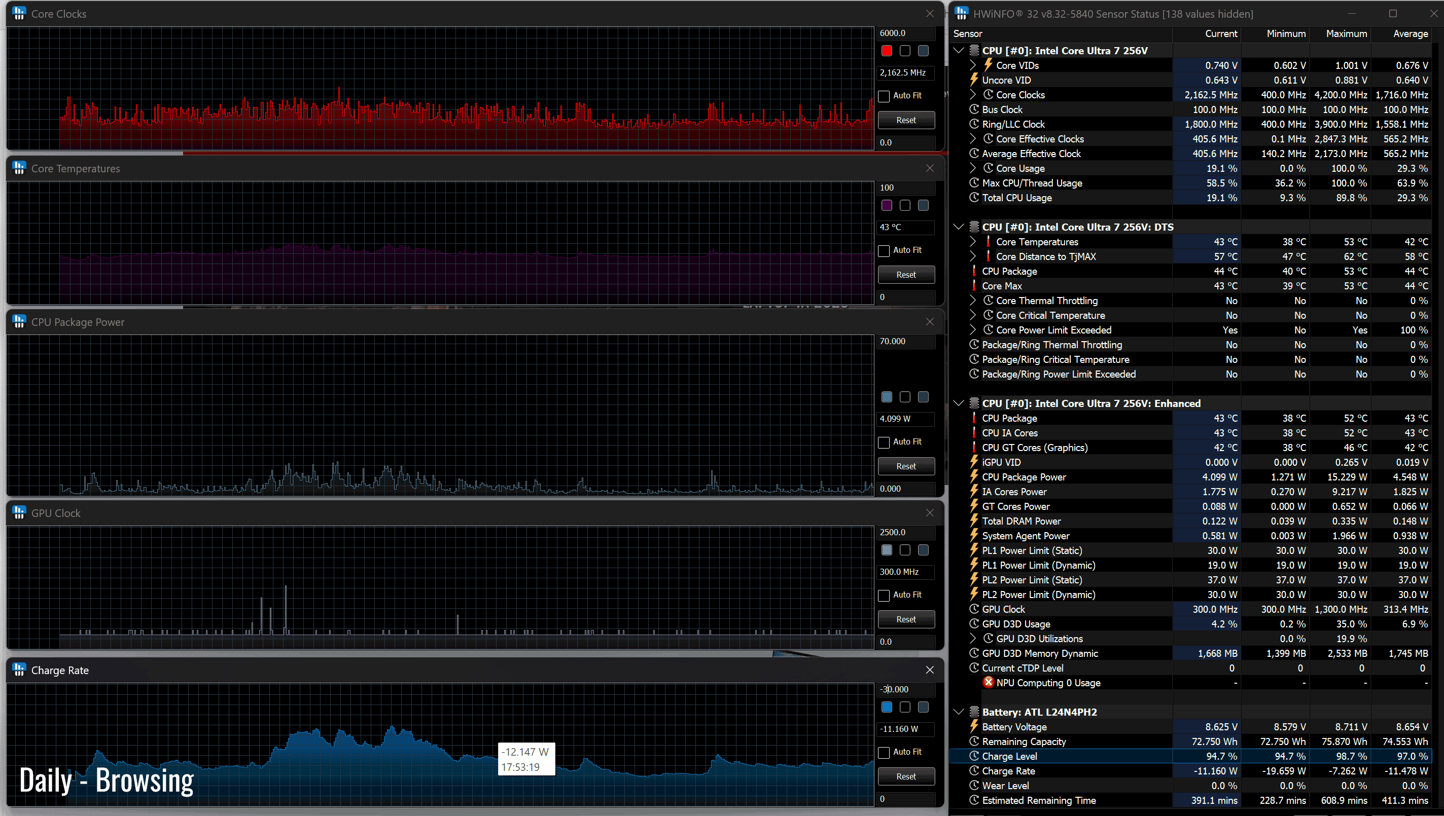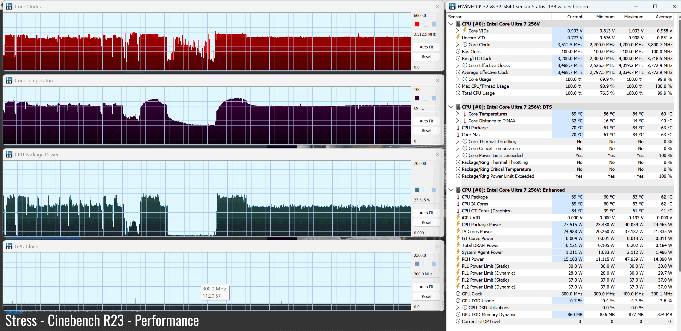 The CPU on this review unit is the Core Ultra 7 256V, with 4 Performance Cores, 4 Low Power Efficiency Cores, and a total of 8 Threads. The hardware works at 28W sustained on Performance mode in this laptop, higher than most Lunar Lake designs.