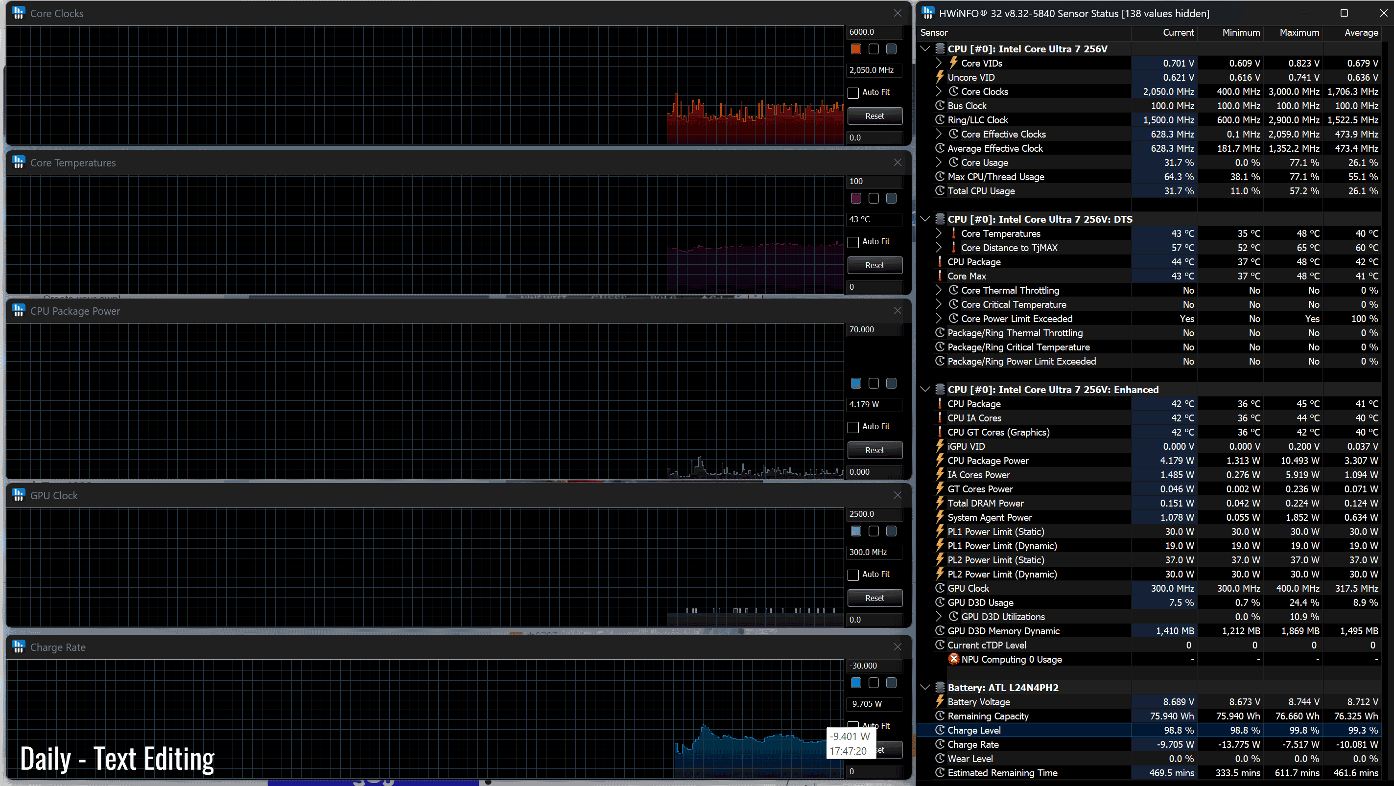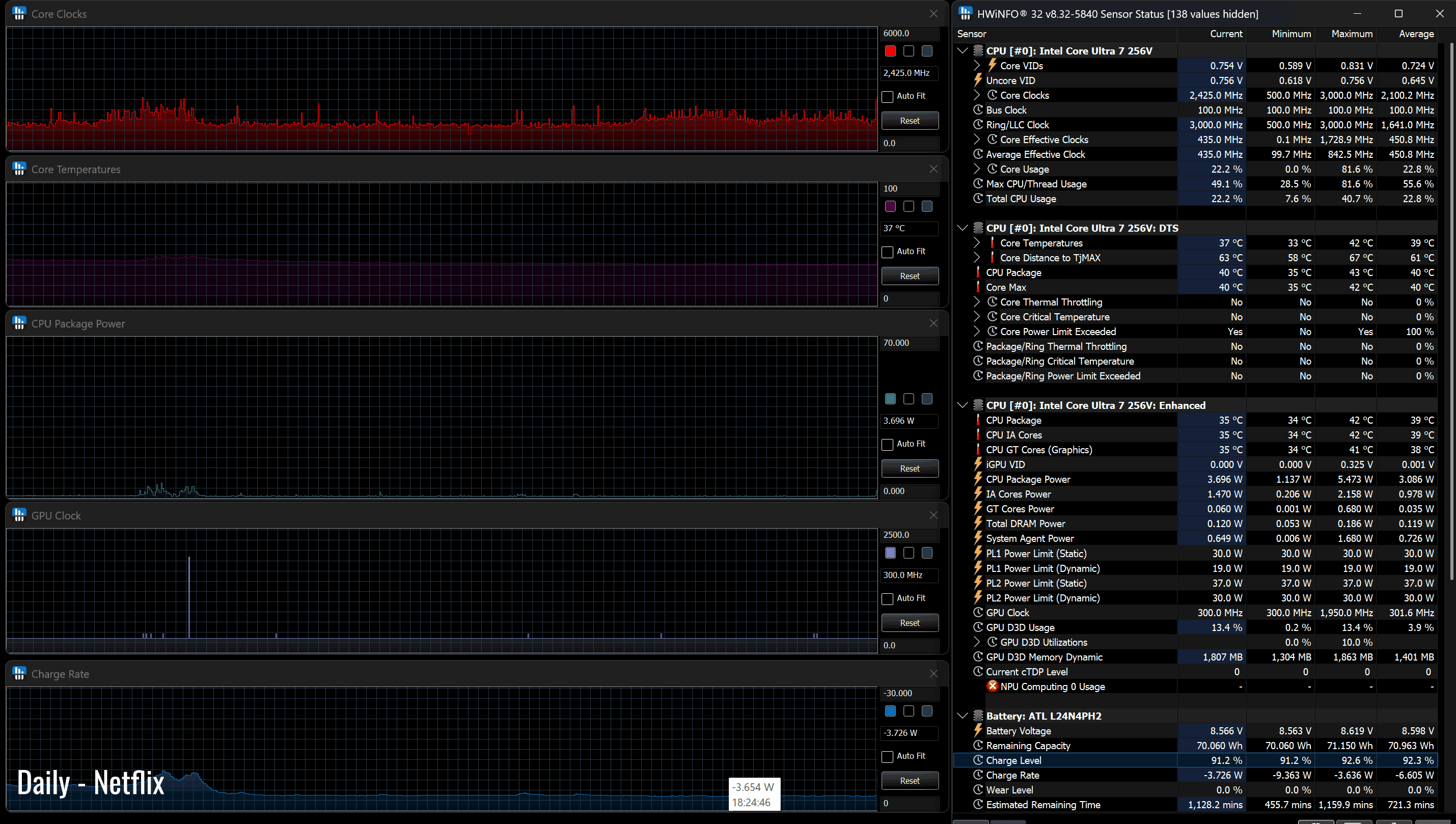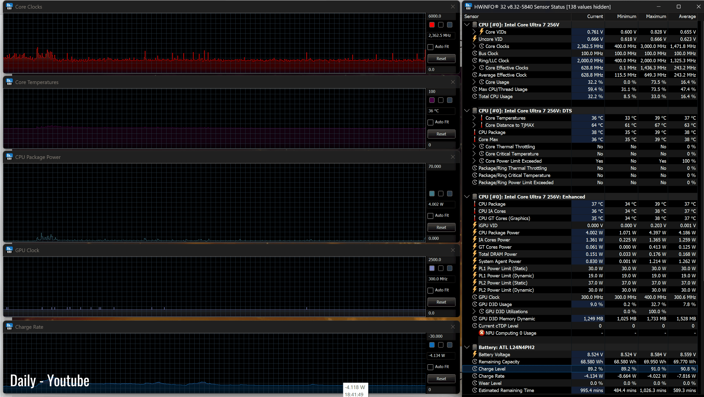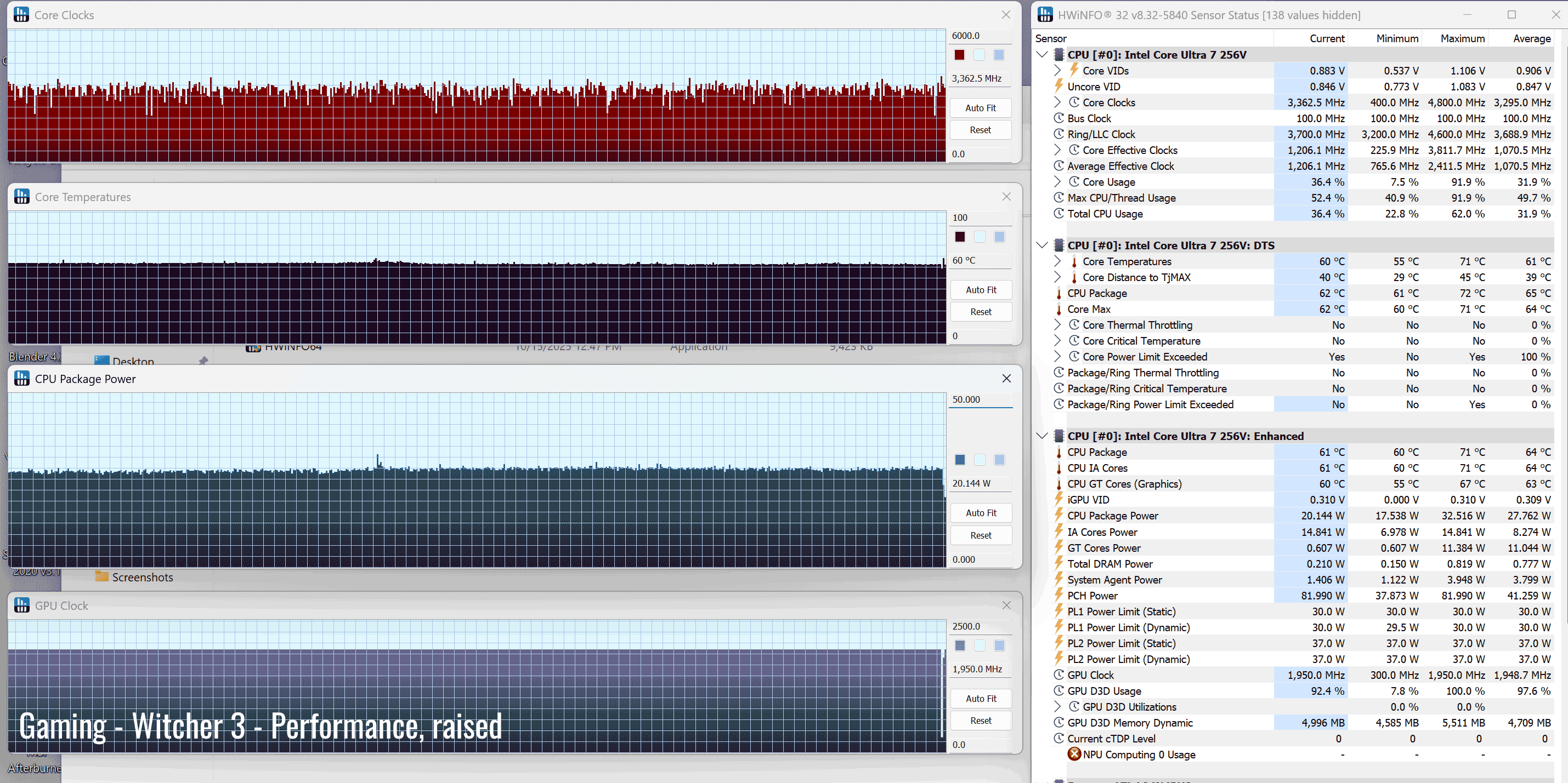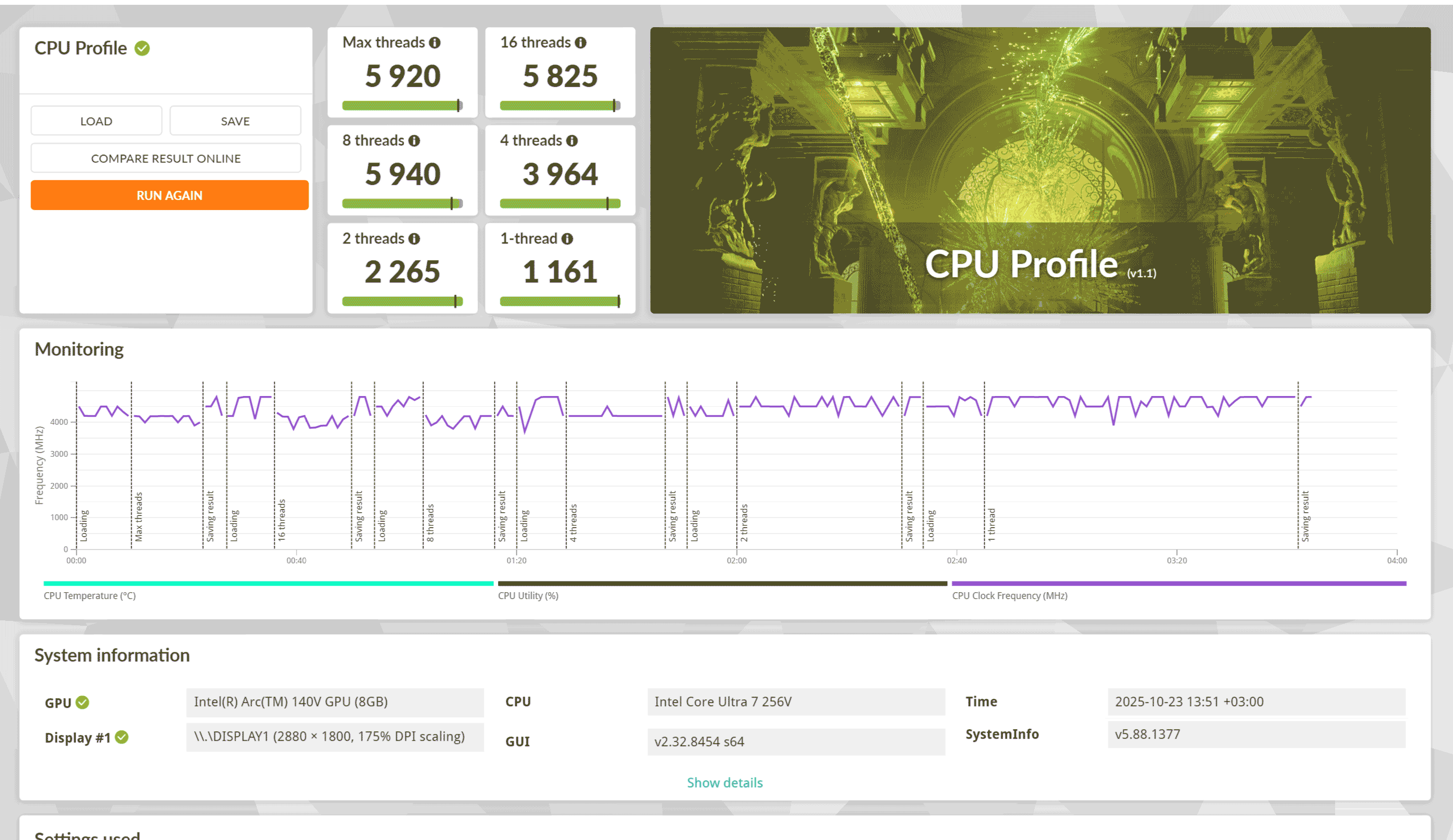 The CPU on this review unit is the Core Ultra 7 256V, with 4 Performance Cores, 4 Low Power Efficiency Cores, and a total of 8 Threads. The hardware works at 28W sustained on Performance mode in this laptop, higher than most Lunar Lake designs.