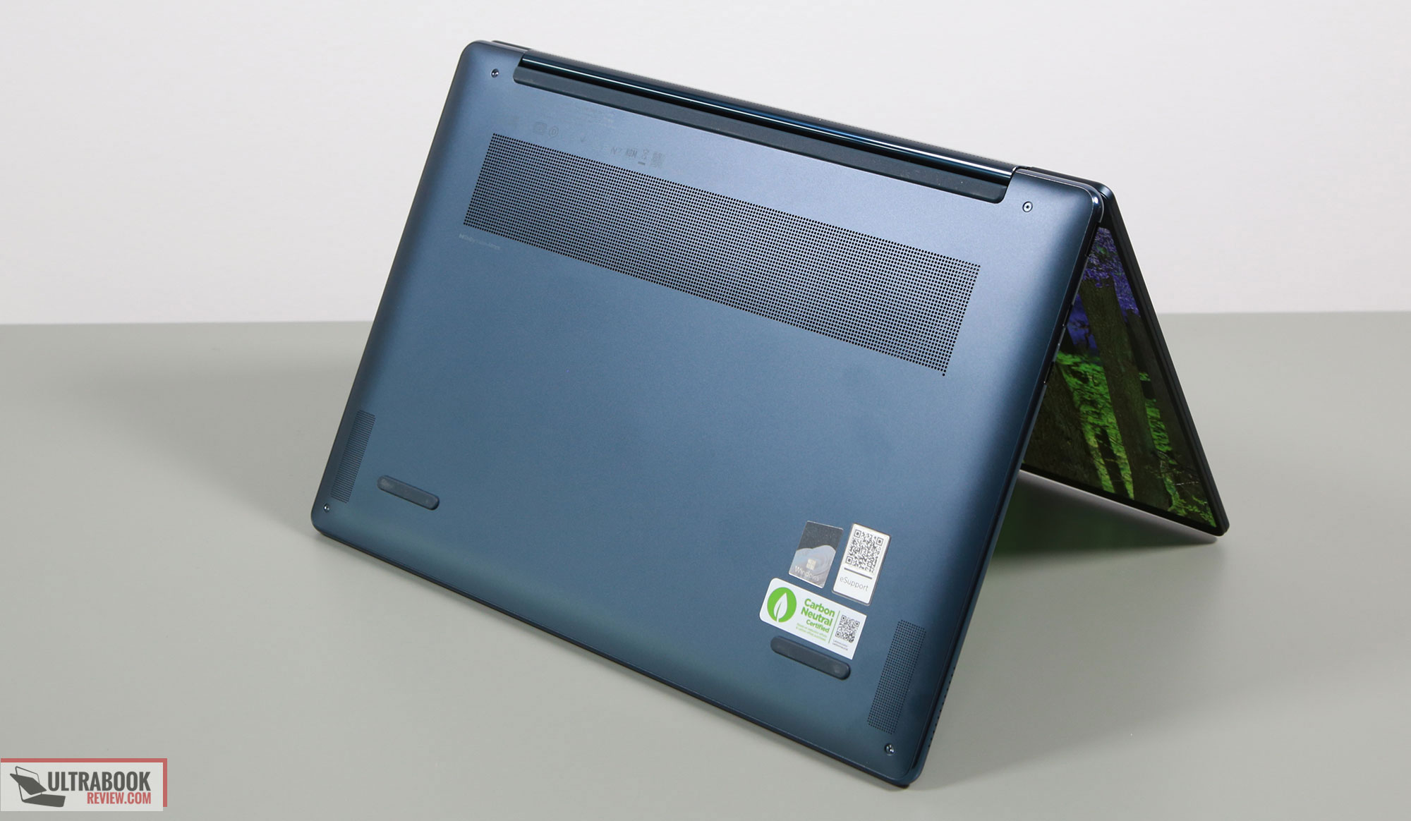 The laptop is only available in this Blue version for this generation, while in the past it was also offered in some gray and beige variants. Most surfaces have a matte coating that does a fair job at fending off smudges, while the edge around the main chassis is shiny. Aesthetically, I’m not a fan of this polished edge, but functionally, it is fine and comfortable on the wrists. Everything else looks good, though, fairly professional, even with the branding elements on the lid and the armrest.