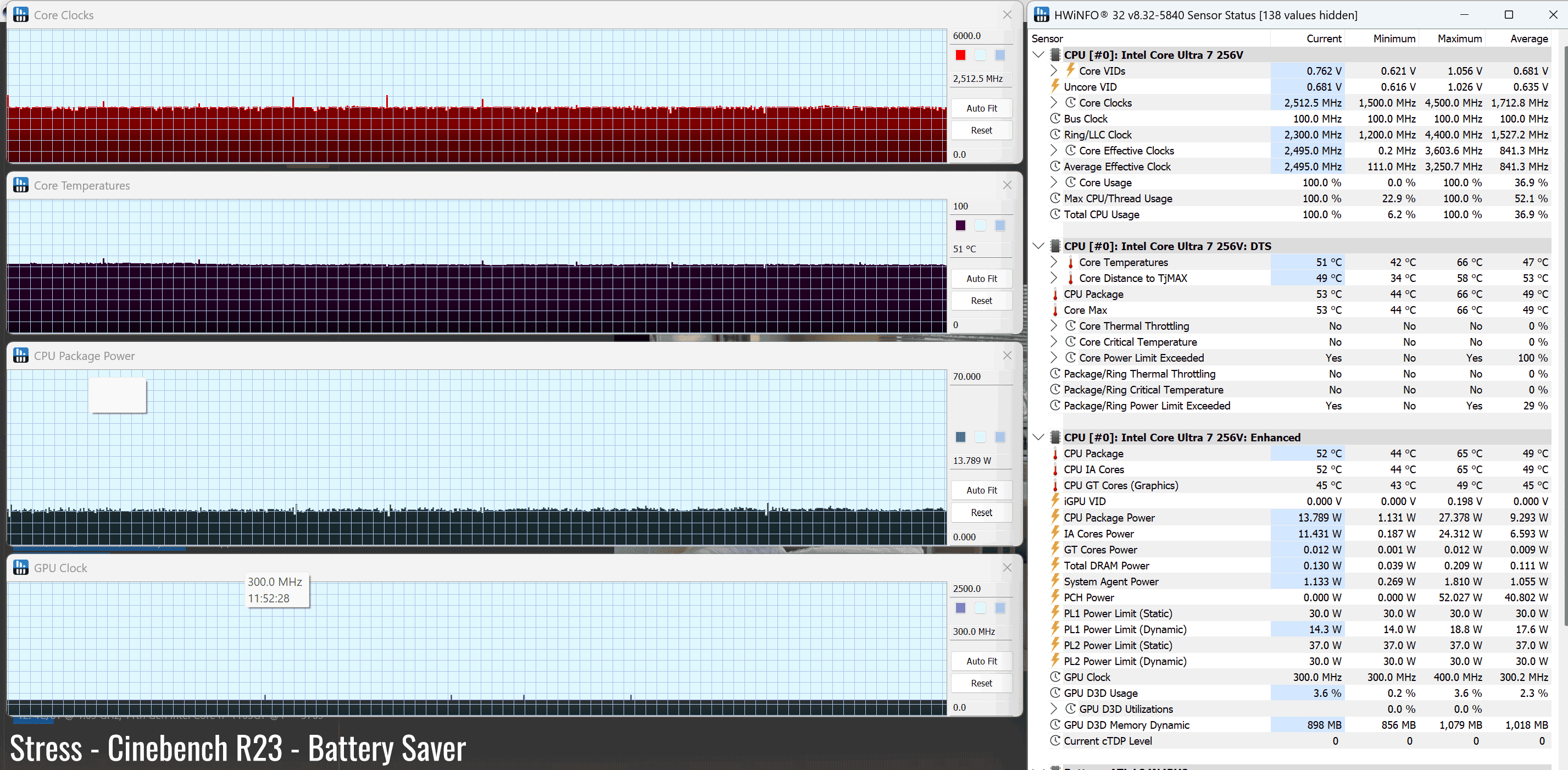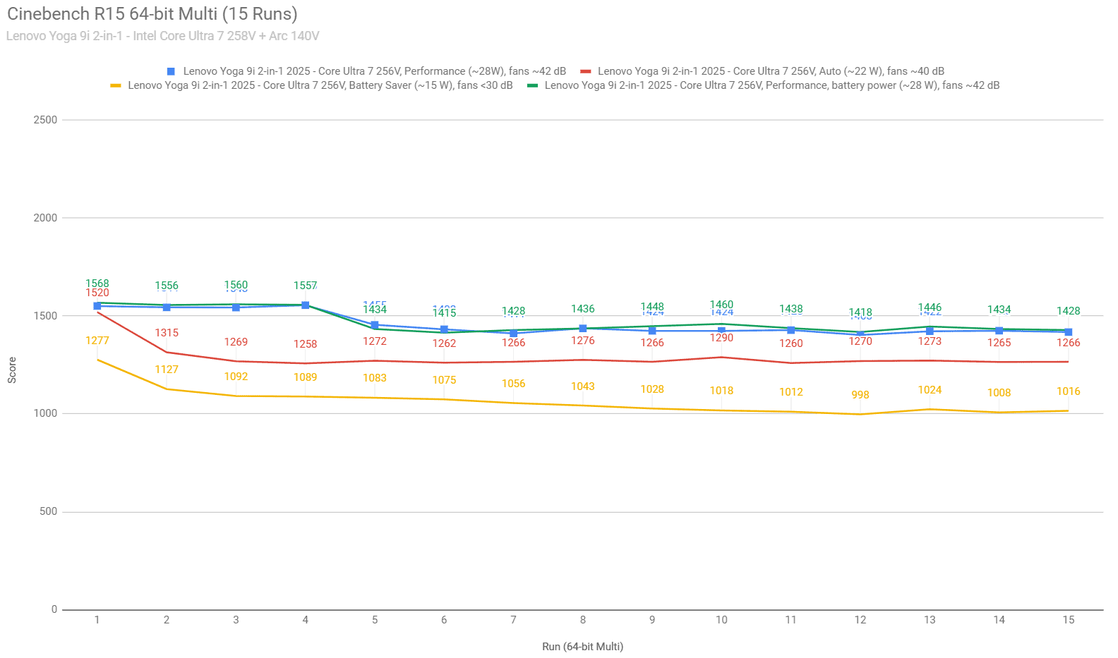 Battery Saver mode is much quieter at under 30 dBA, but limits the hardware at 15W sustained, with a more notable impact on the scores.