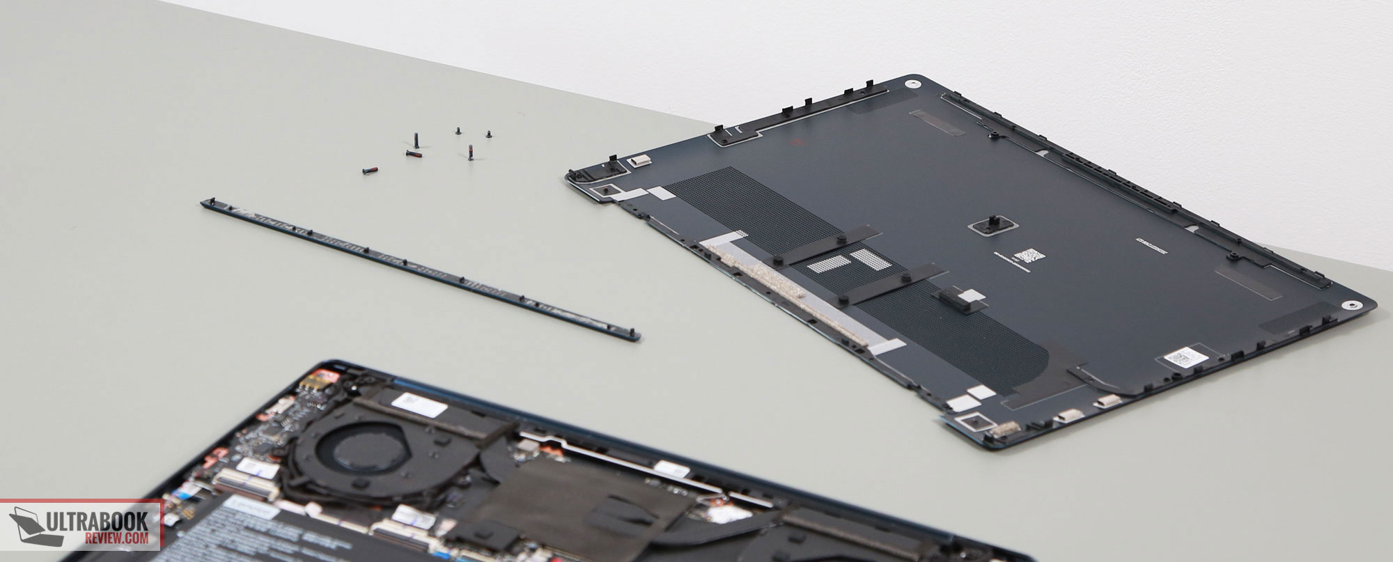 The SSD is the only upgradeable component inside the laptop. To get inside, you need to remove the back panel held in place by only four Torx screws of the same size.