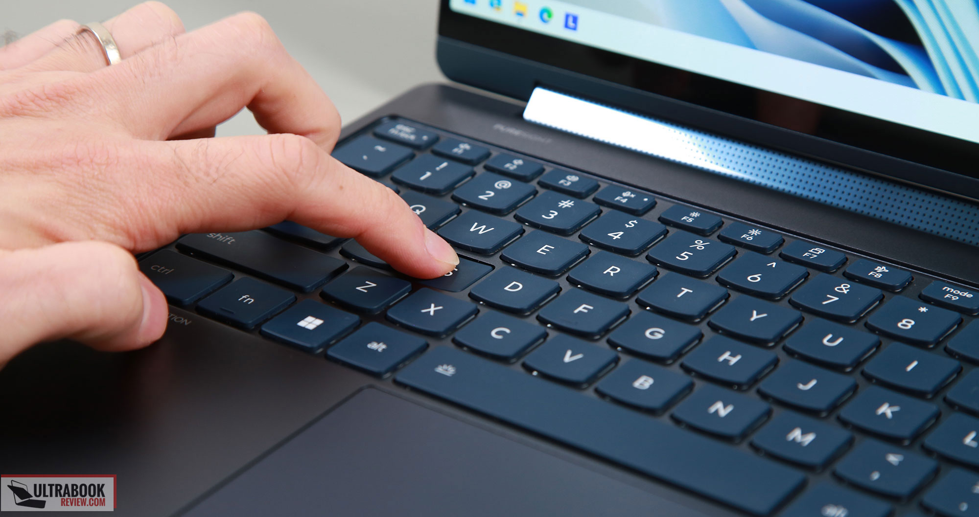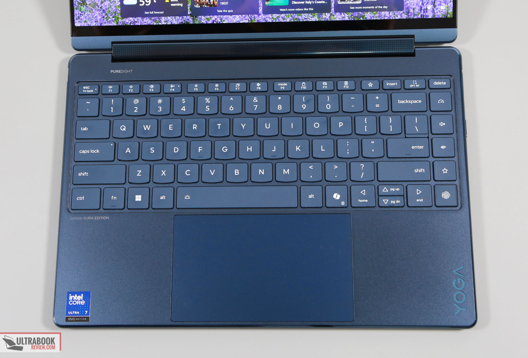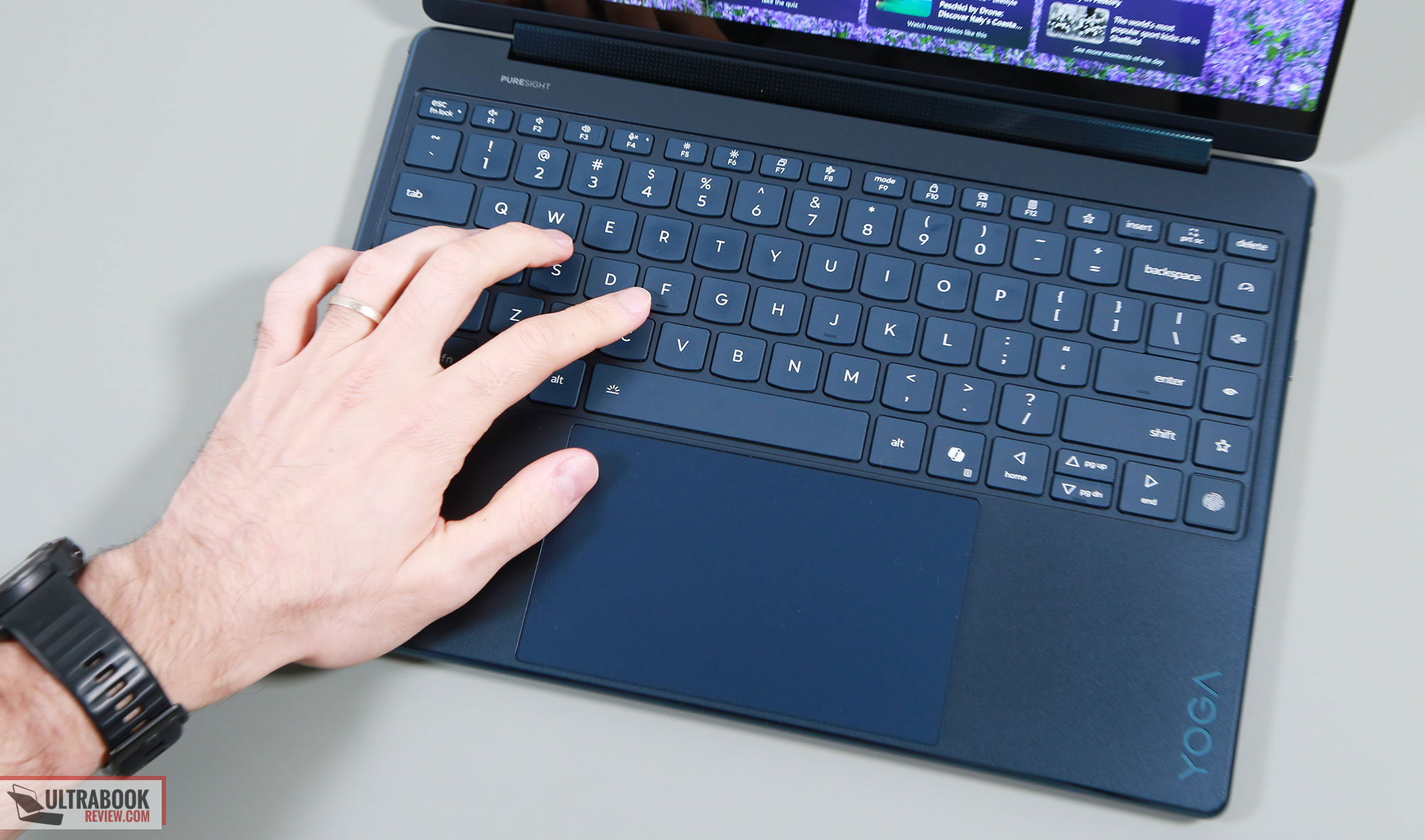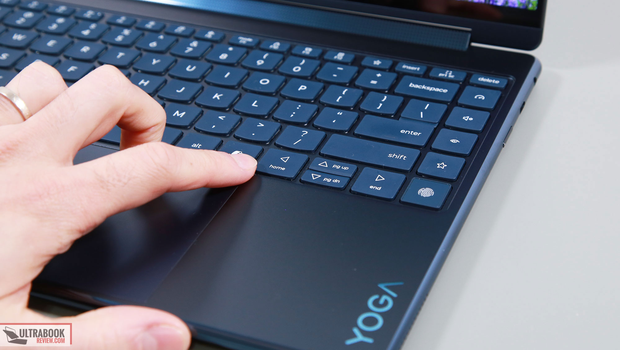 The keyboard is standard for a premium-tier Yoga, with full-size smooth keycaps that color match the laptop’s blue theme. They have a slight dash in them and offer good feedback and clickiness, with 1.5 mm of travel depth.