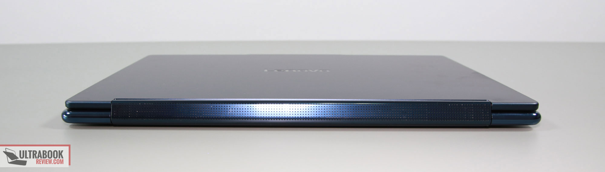 As a convertible design, the hinge on this Yoga 9i allows you to rotate the display all the way to the back, so you can use this as a laptop, as a tablet, or anything in between. And the hinge implements speakers in it.