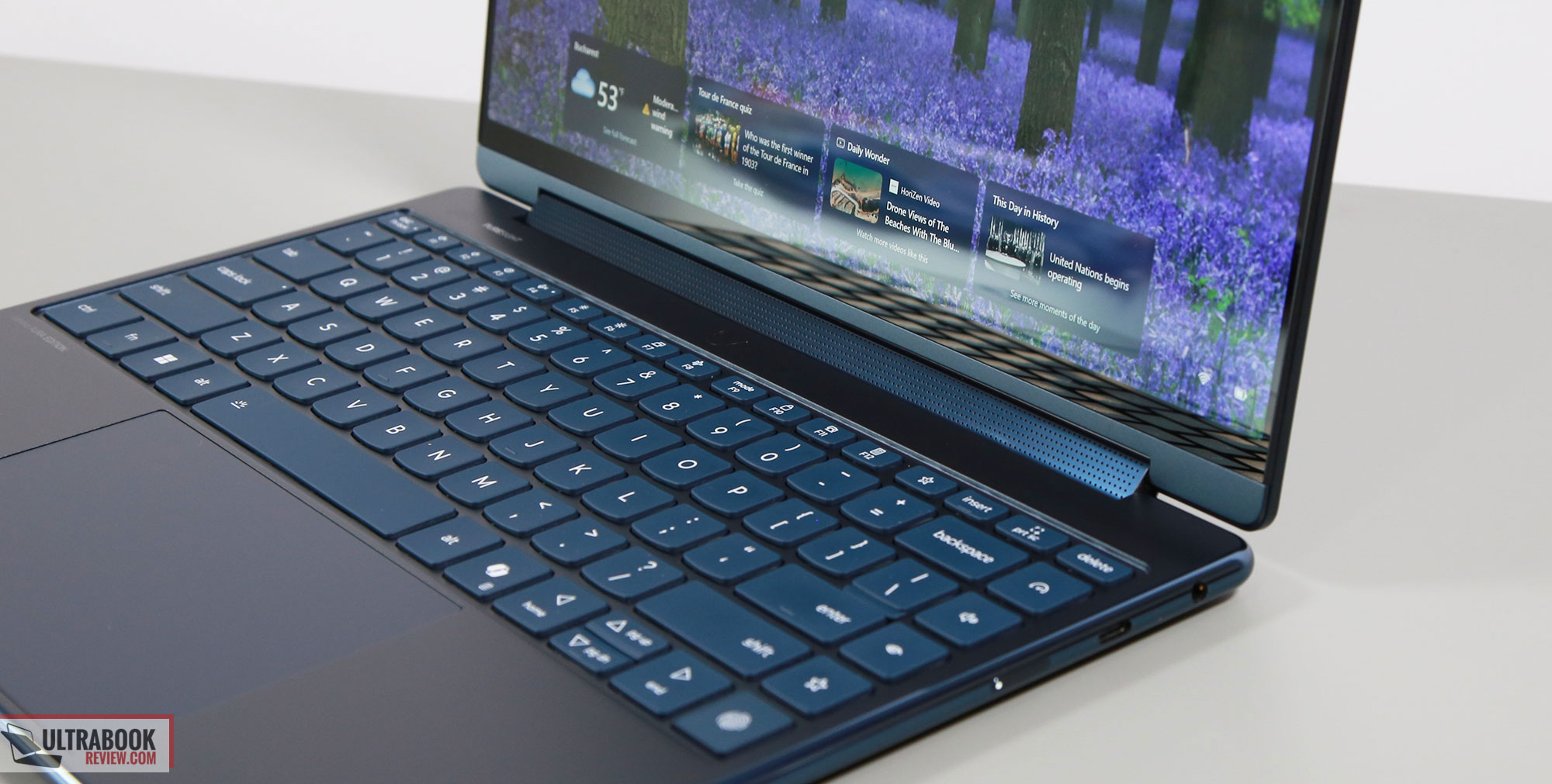 There’s a proper keyboard and a large glass touchpad on this device, centered on the middle of the chassis.