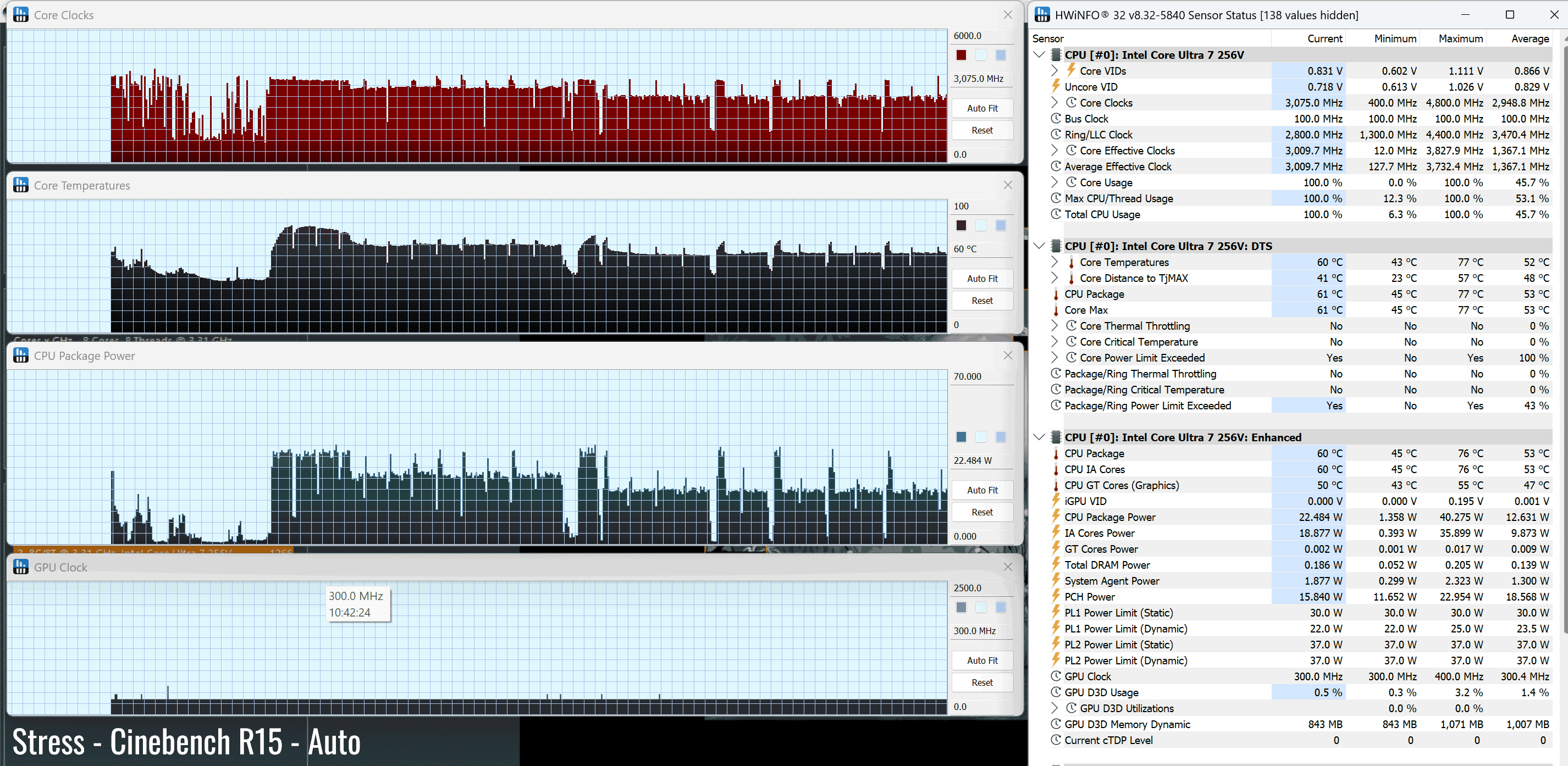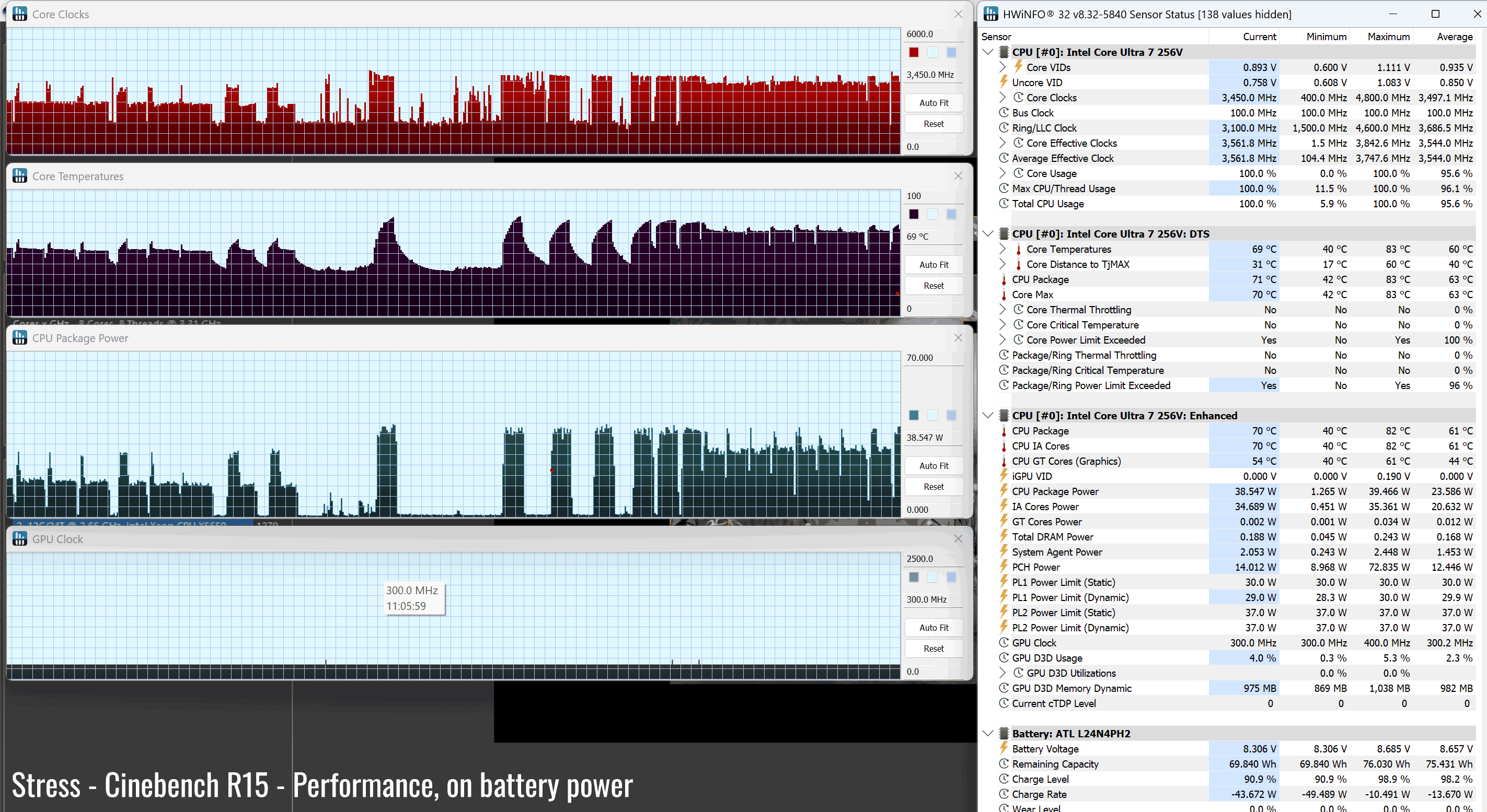 This cooling module allows for excellent internal temperatures under sustained loads. Have the laptop raised off the desk, and the CPU package will run in the 60s °C for most sustained activities. That’s way cooler than on other Lunar Lake models tested so far.