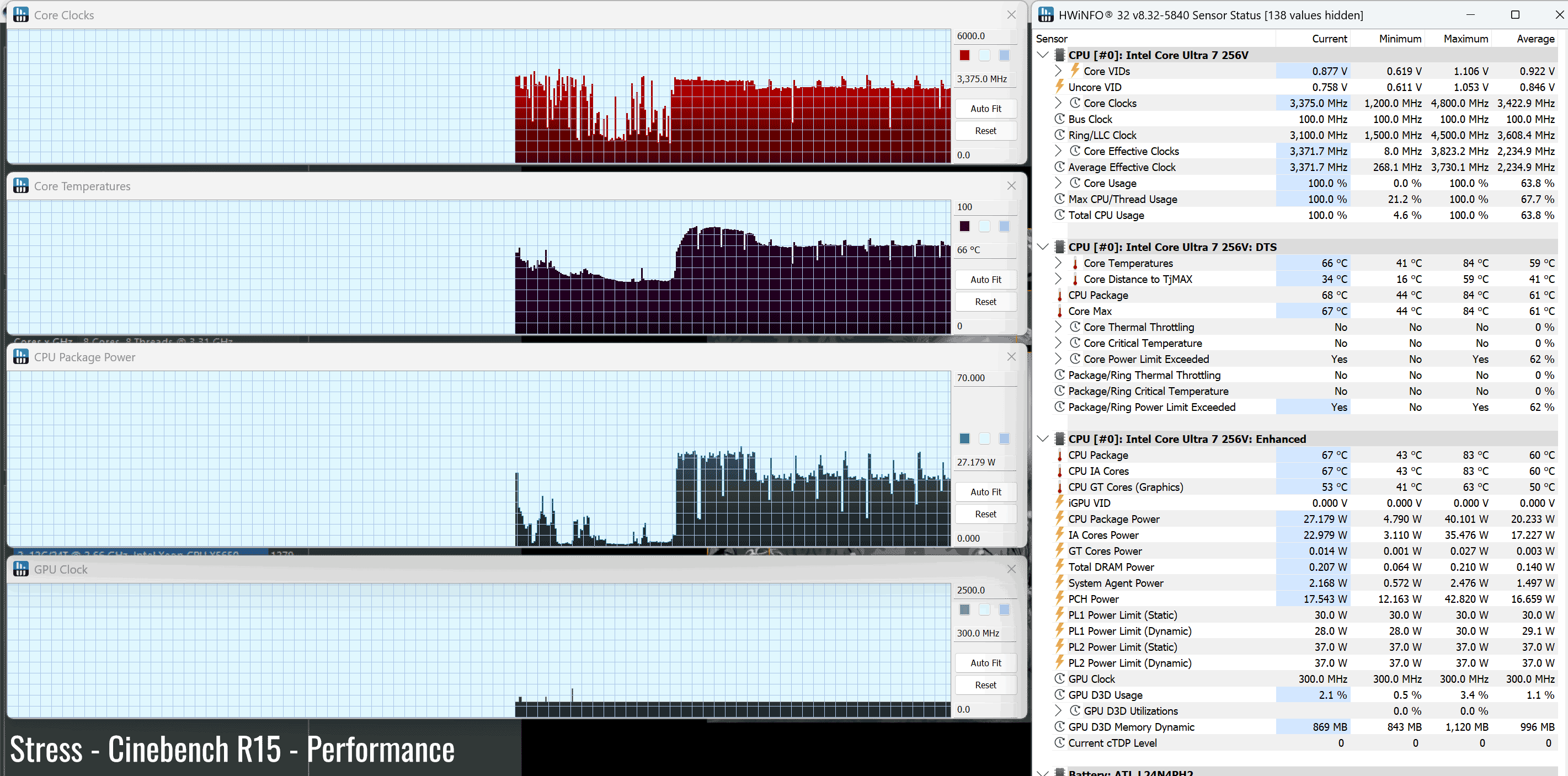 On Performance, the hardware runs at its peak design PL power of ~38W for a bit, and then stabilizes at 28W, with internal temperatures in the mid-60s °C and fan noise of 42 dBA. The laptop scores around 1250 points.