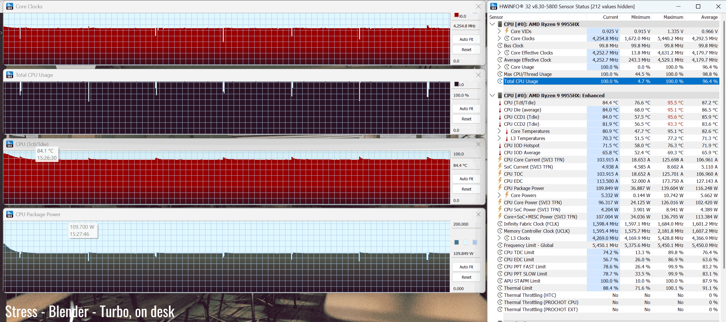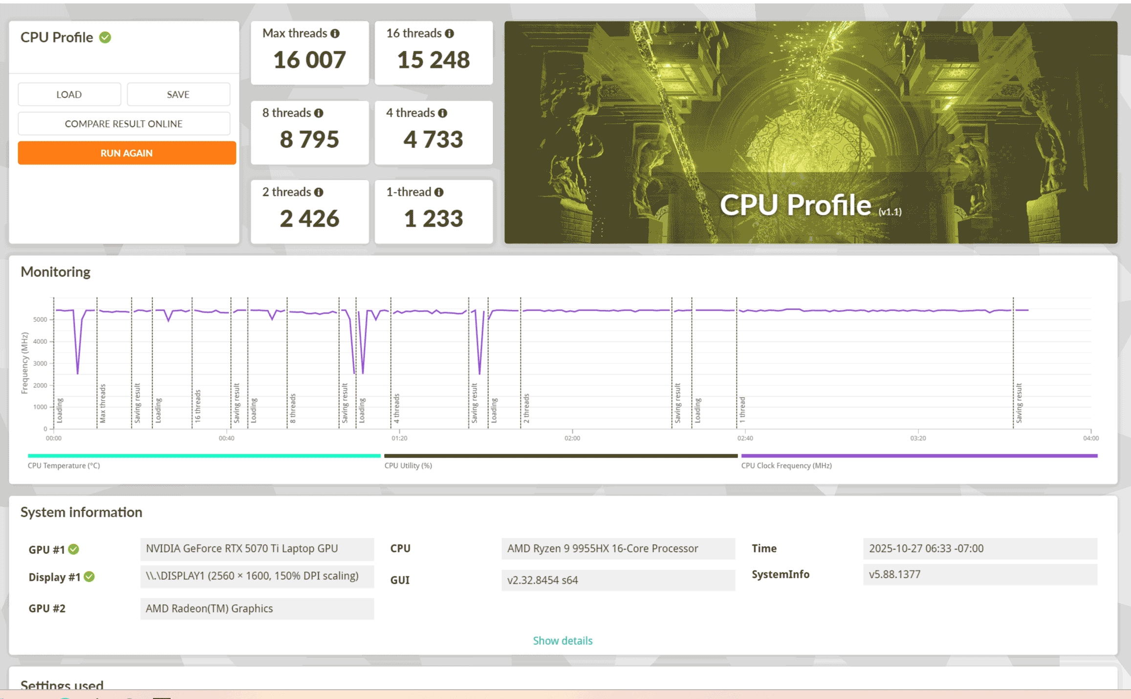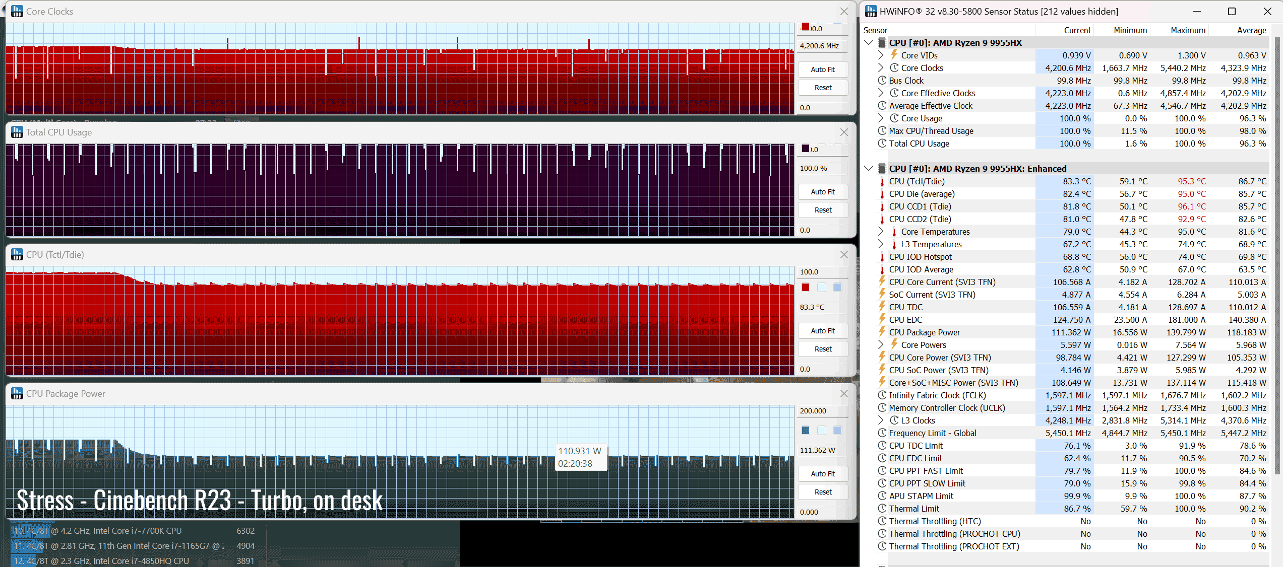 The AMD Ryzen 9 9955HX is a top mobile processor part of the AMD Fire Range platform , with 16 Zen5 Cores and 32 Threads. This is not a hybrid design; it only integrates full-performance Zen5 cores, with HyperThreading. The hardware runs at ~120W sustained TDP in this chassis, with excellent temperatures up to low-80s °C.