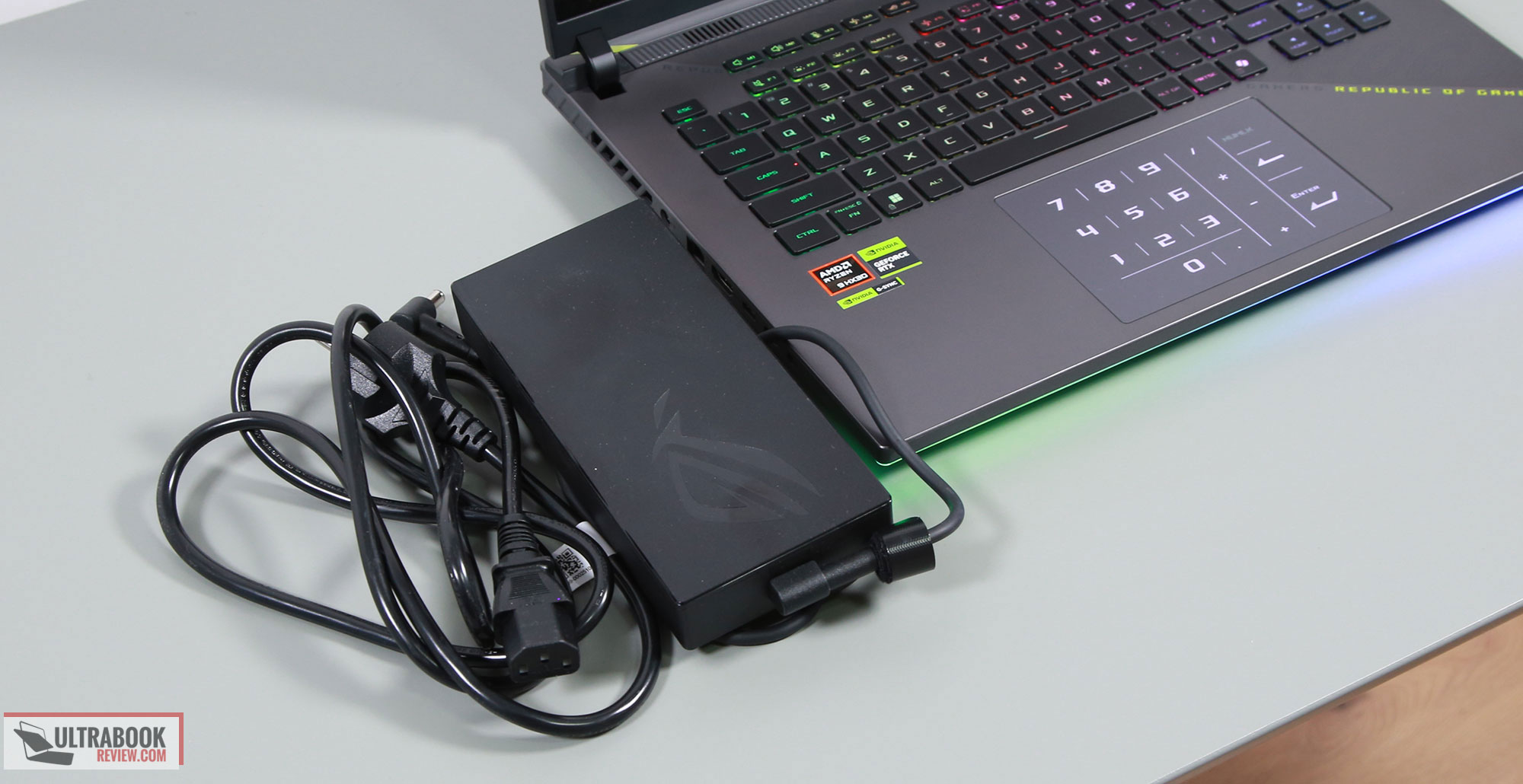 Asus pairs this configuration with a 280W charger, a dual-piece design with long cables, and a mid-sized power brick. It weighs about .75 kilos. The same charger is bundled with the 5070Ti configurations of the Intel variant.