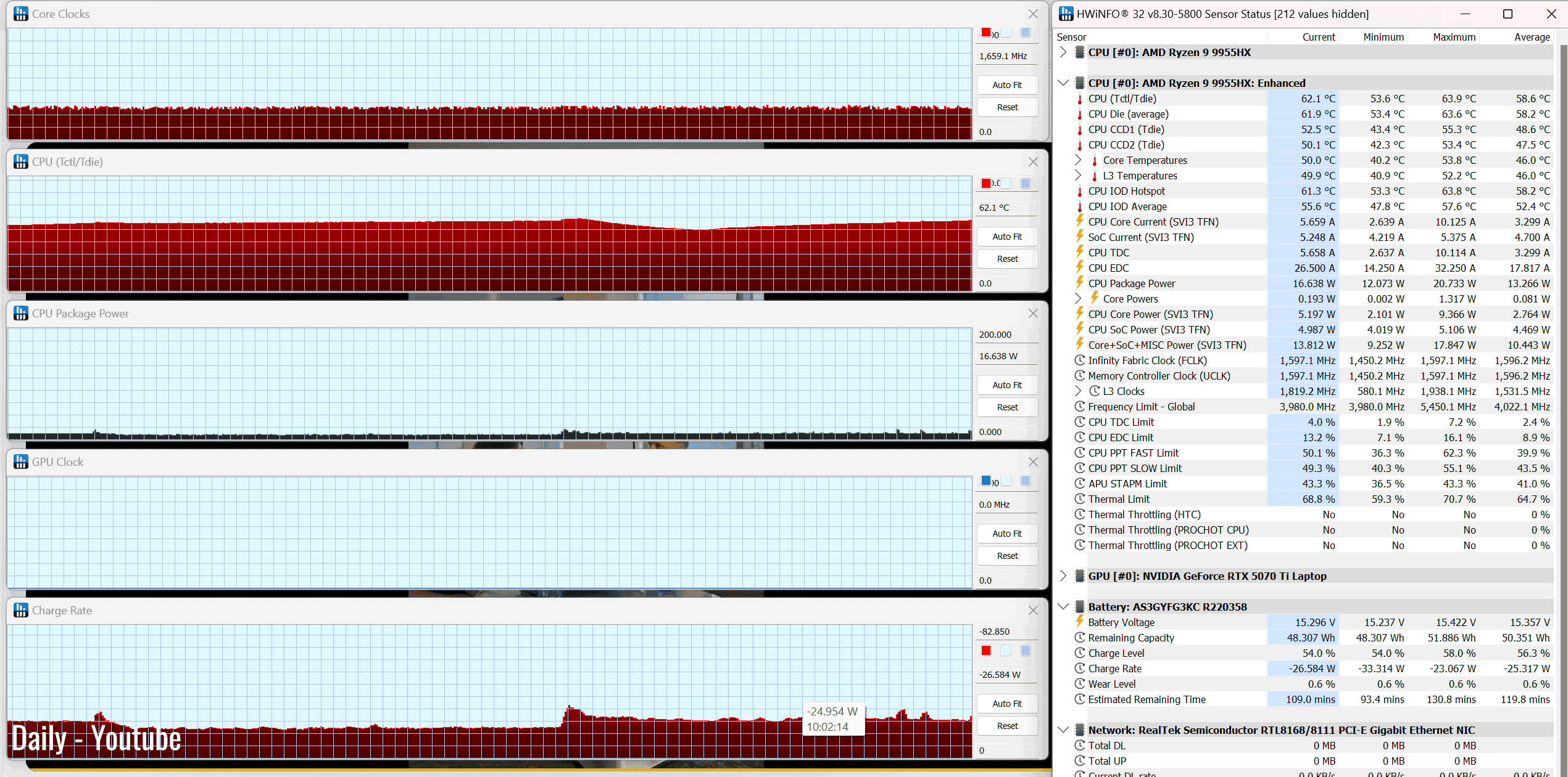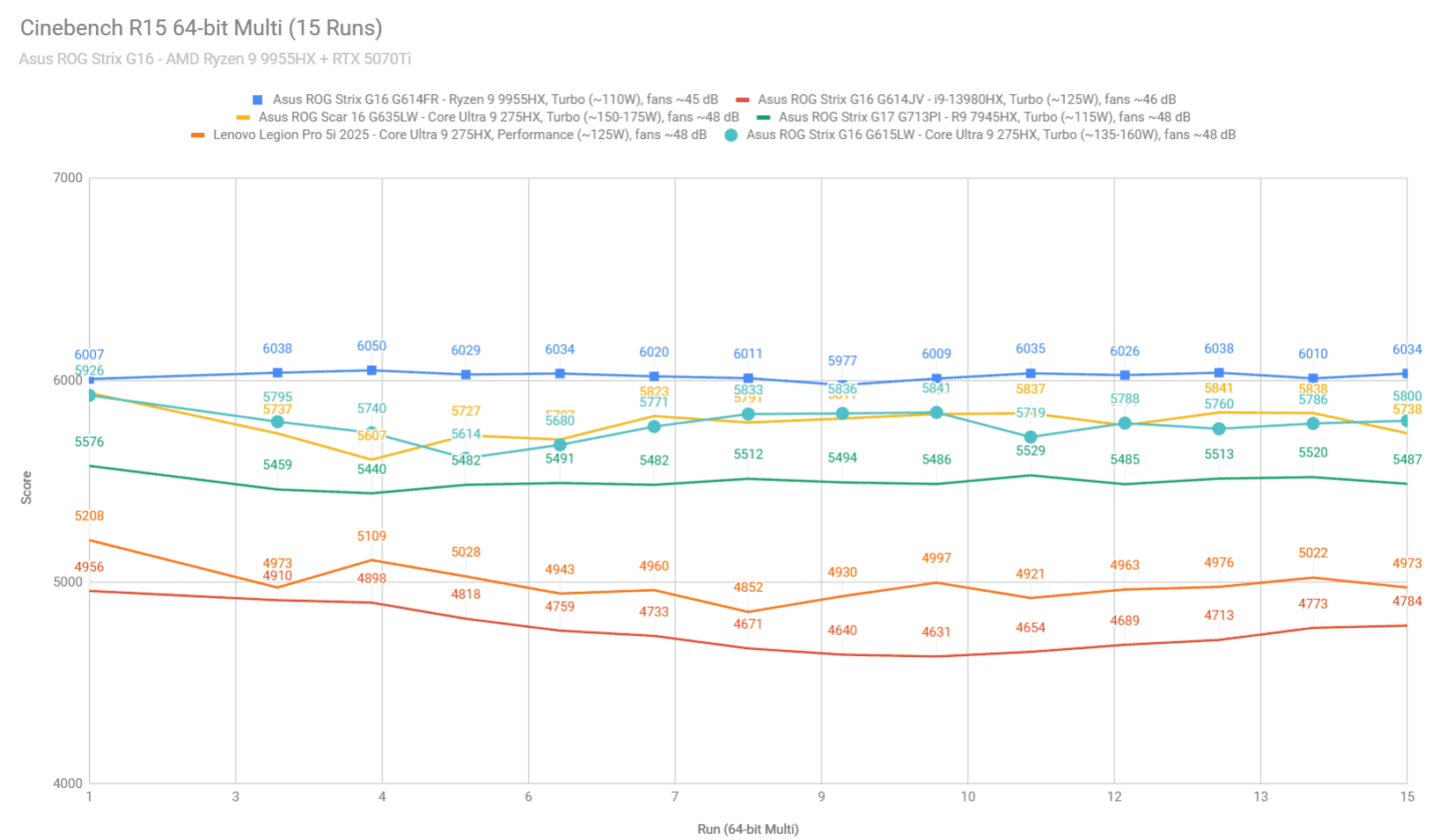 But the G614 chassis has two perks of its own: it’s lighter weight and should allow for more competitive pricing. That varies between regions, though, but for the most part, the Ryzen 9 9955HX + RTX 5070Ti model tested here is competitively priced in most markets. The 9955HX3D variant, on the other hand, that’s a lot more expensive, and the difference is hardly justifiable in real use, even in gaming when the 3D CPU has a slight edge.