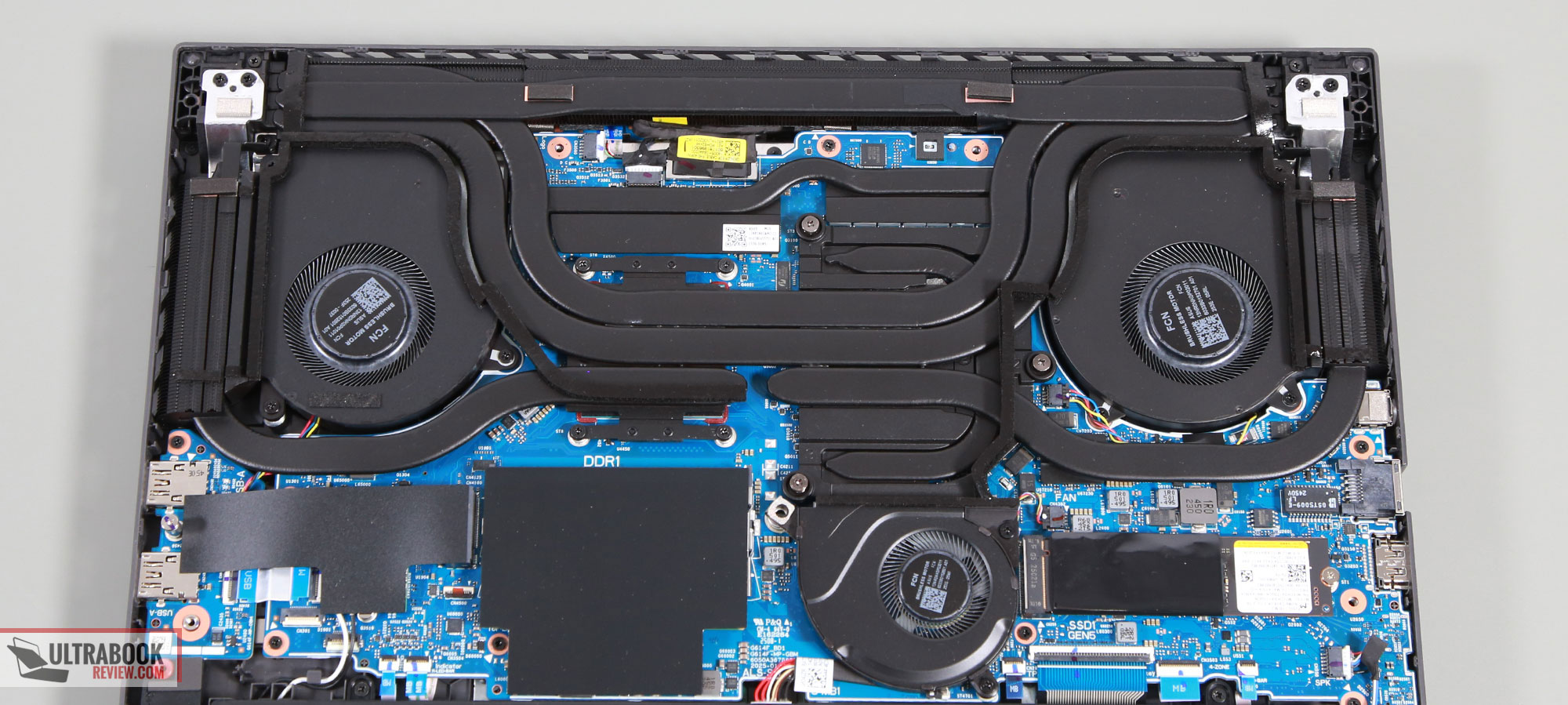 For memory and storage, the laptop comes with two accessible memory DIMMs and two M.2 2280 SSD slots – one of the slots supports PCIe 5.0 drives, but most of the retail models ship with gen4 drives anyway.