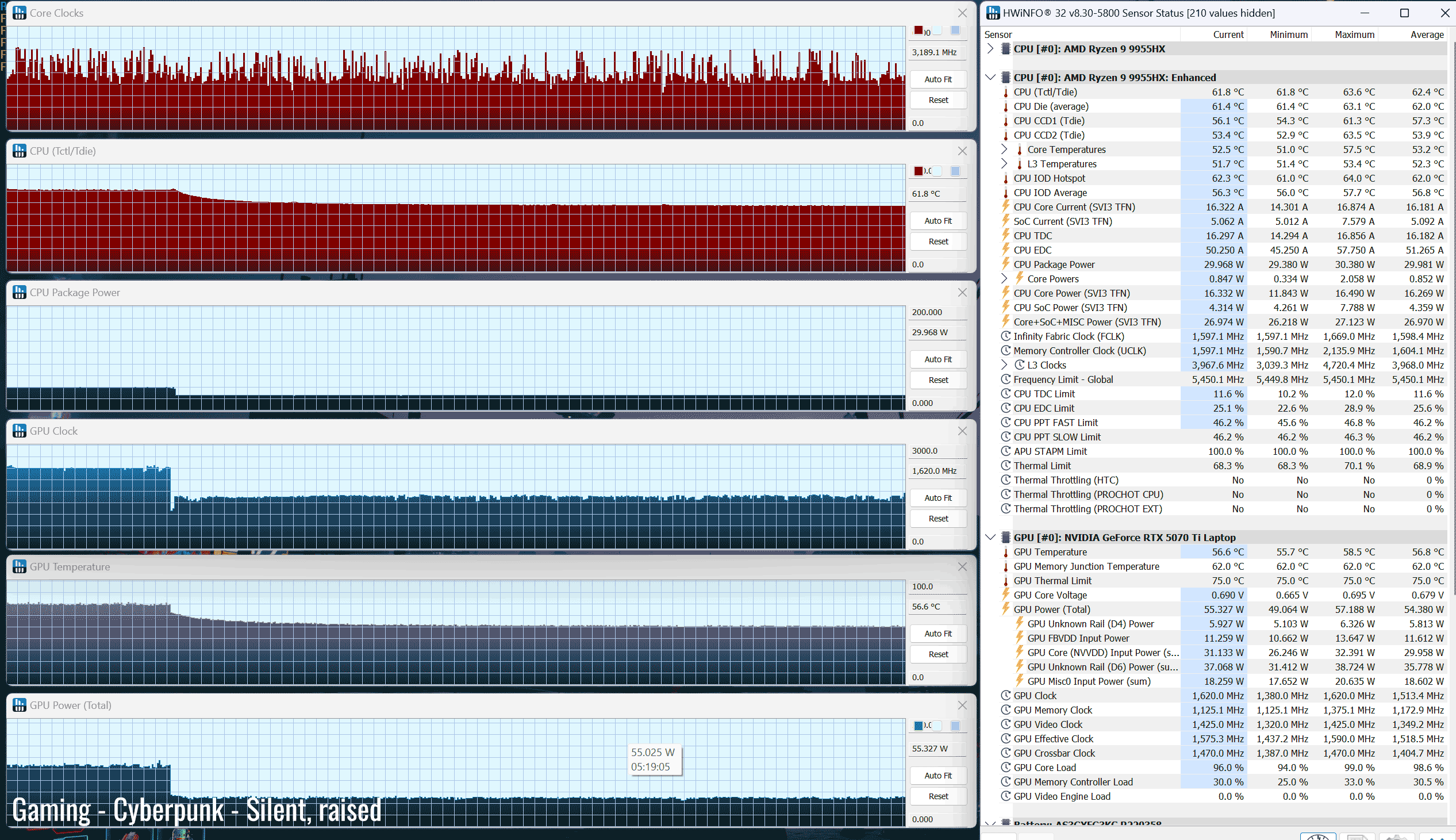 *Gaming – Silent – playing Cyberpunk for 30 minutes, fans at <35 dB