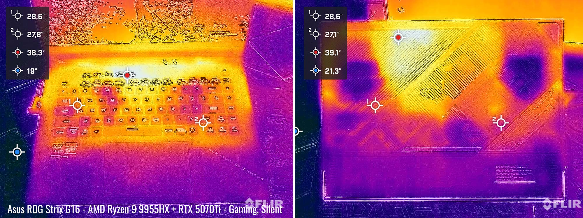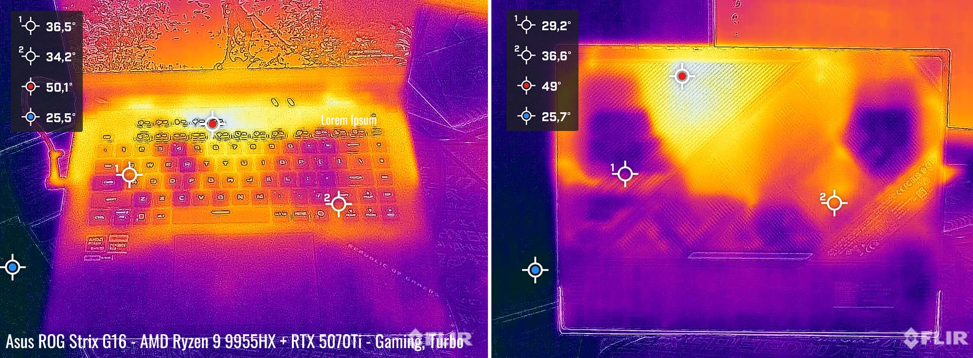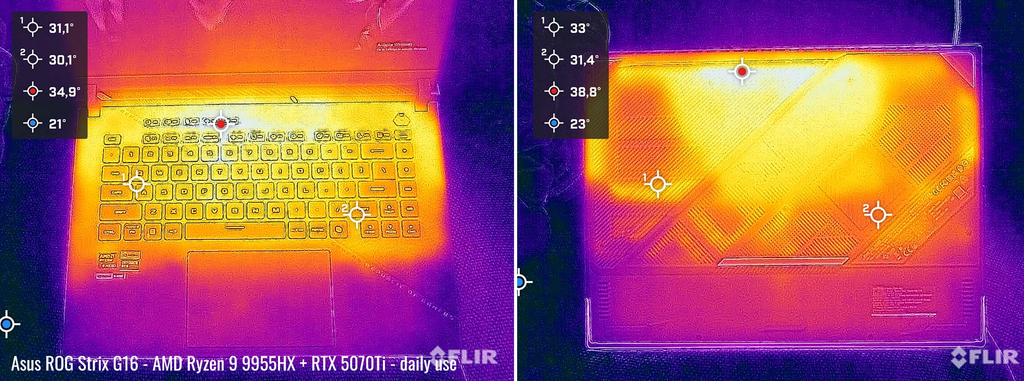 I haven’t tested the RTX 5070Ti configuration of the Intel Strix G16 version, but given the more advanced cooling on that chassis, expect even lower thermals. Furthermore, based on what we know from our RTX 5080 unit, expect that one to be able to run much cooler while kept flat on a desk.