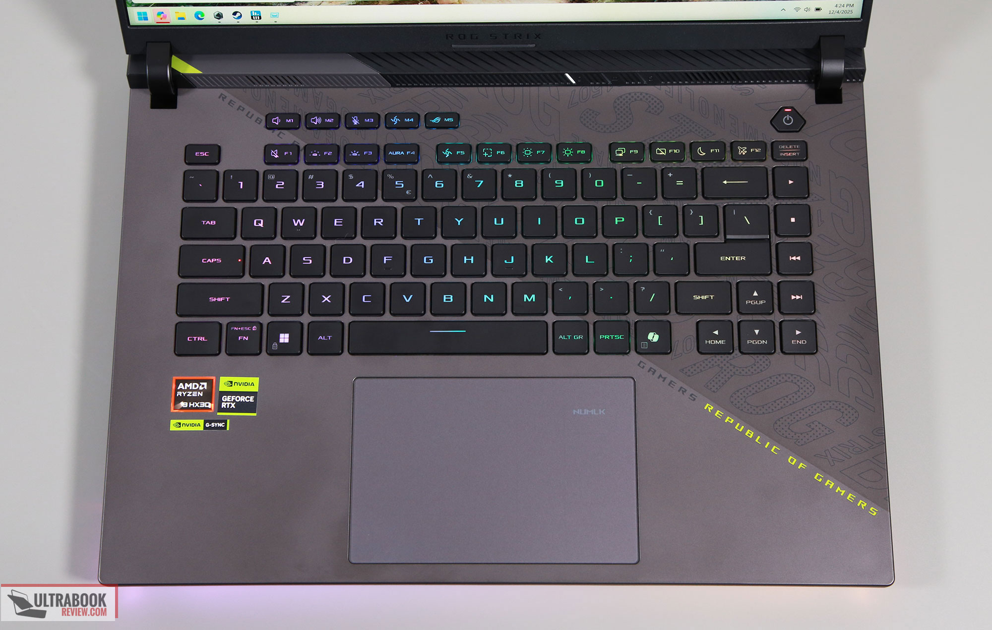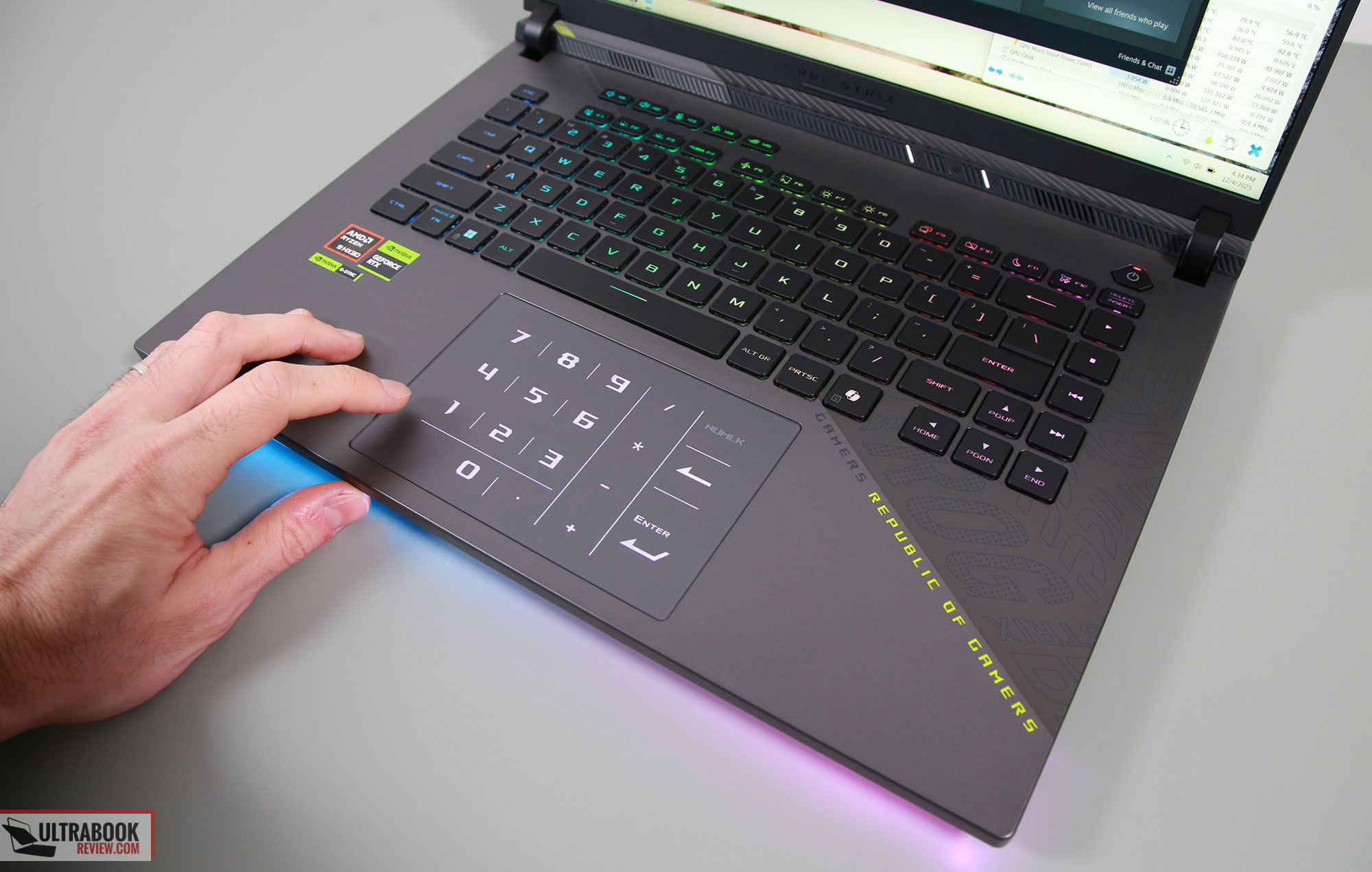 The touchpad is a glass surface centered on the chassis, and it’s a little smaller in this implementation than on the updated Intel Strix G16 model. It’s still spacious enough for me, though, and works fine with touches, swipes, gestures, and clicks. I’d even argue I preffer having this smaller touchpad with extra space at the top and bottom that better separates it from the keyboard area and the front lip, preventing unwanted ghost swipes.