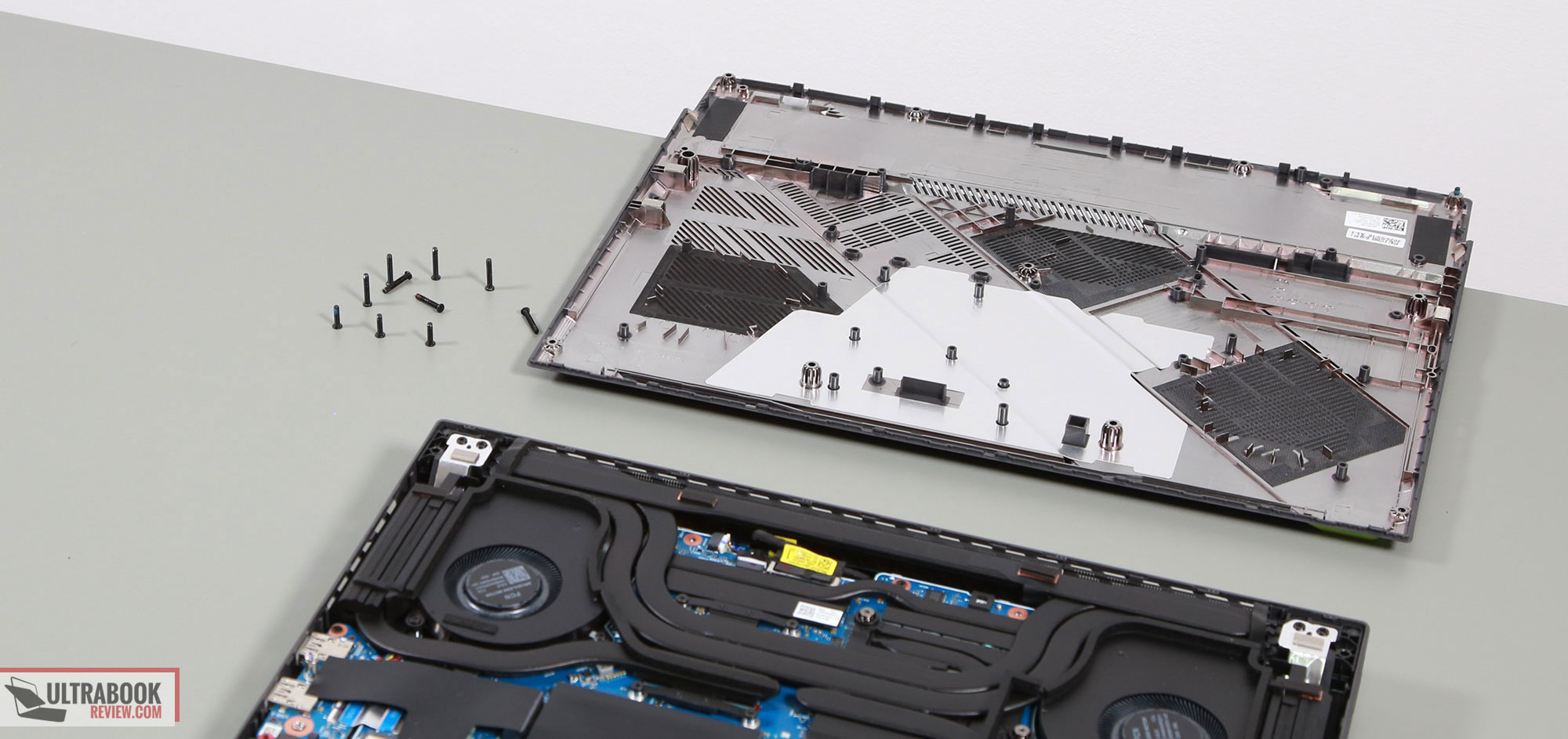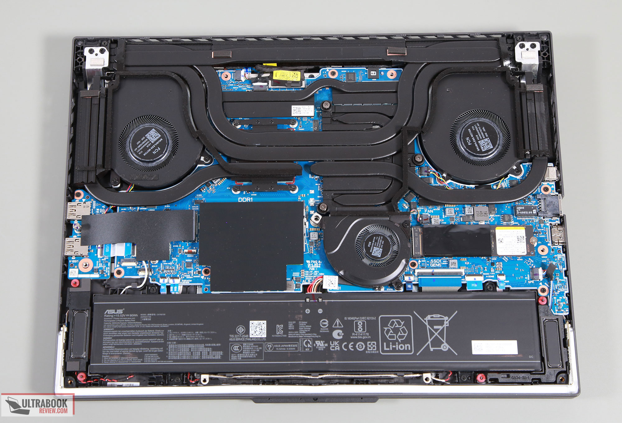 Getting inside to the components is not a tool-less process on this chassis, unlike on the updated G16 G615. You have to take apart a handful of Philips screws, of different lengths, with the one in the lower-right corner being a pop-up screw. The back panel comes out with some effort, and inside you’ll find all the hardware and the cooling module, the SSD/RAM/Wifi slots, and the battery and speakers. Everything is packed up neatly, without any space left unused.