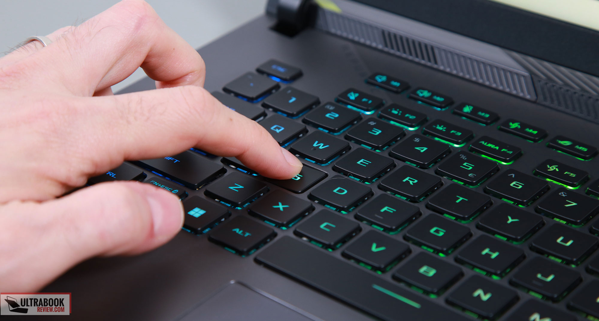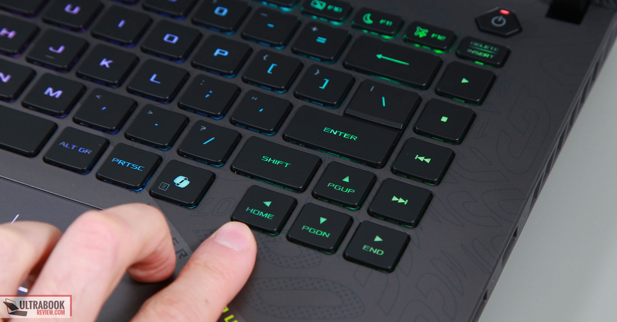 The keyboard is a standard 16-inch ROG layout, without a Numpad, with the extra keys at the top left, with the full-size arrows and the extra media column at the very right. I still think these are wasted as media keys and should have been pegged for Home/End/PgUp/PgDn instead, but hey, at least you can remap them yourself if needed.