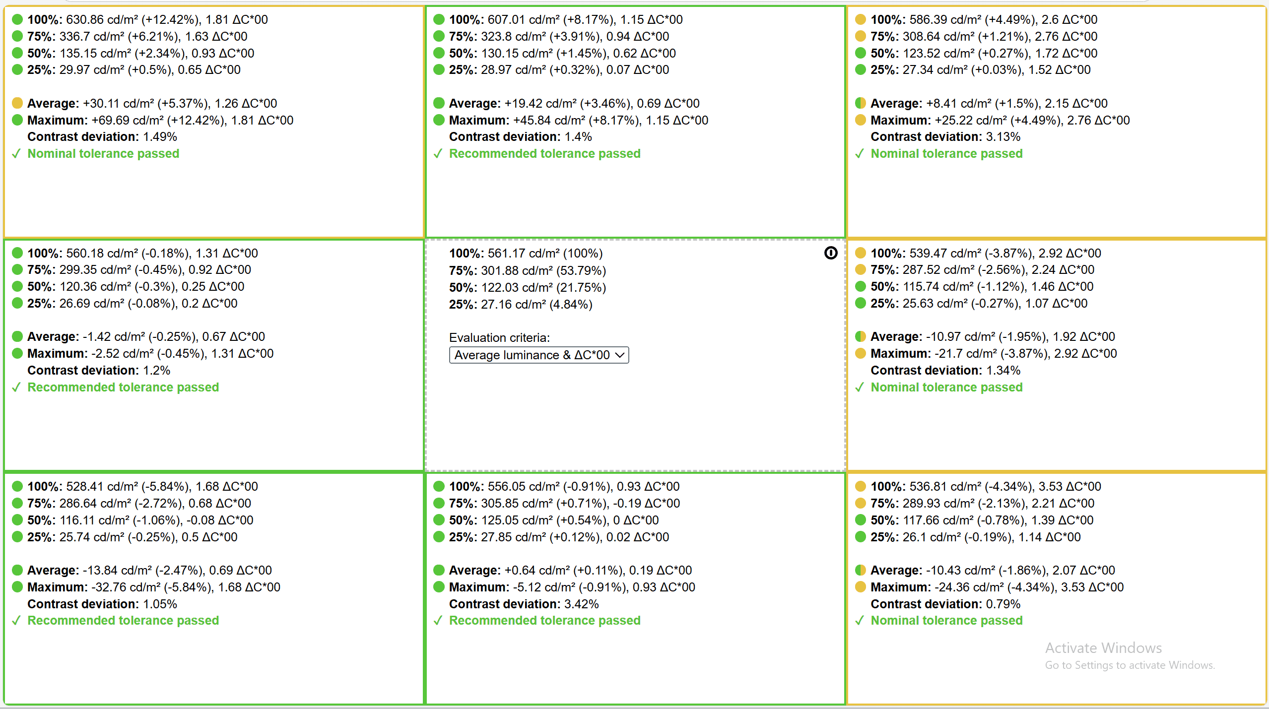 Max brightness in the middle of the screen: 589.55.88 cd/m2 on power;