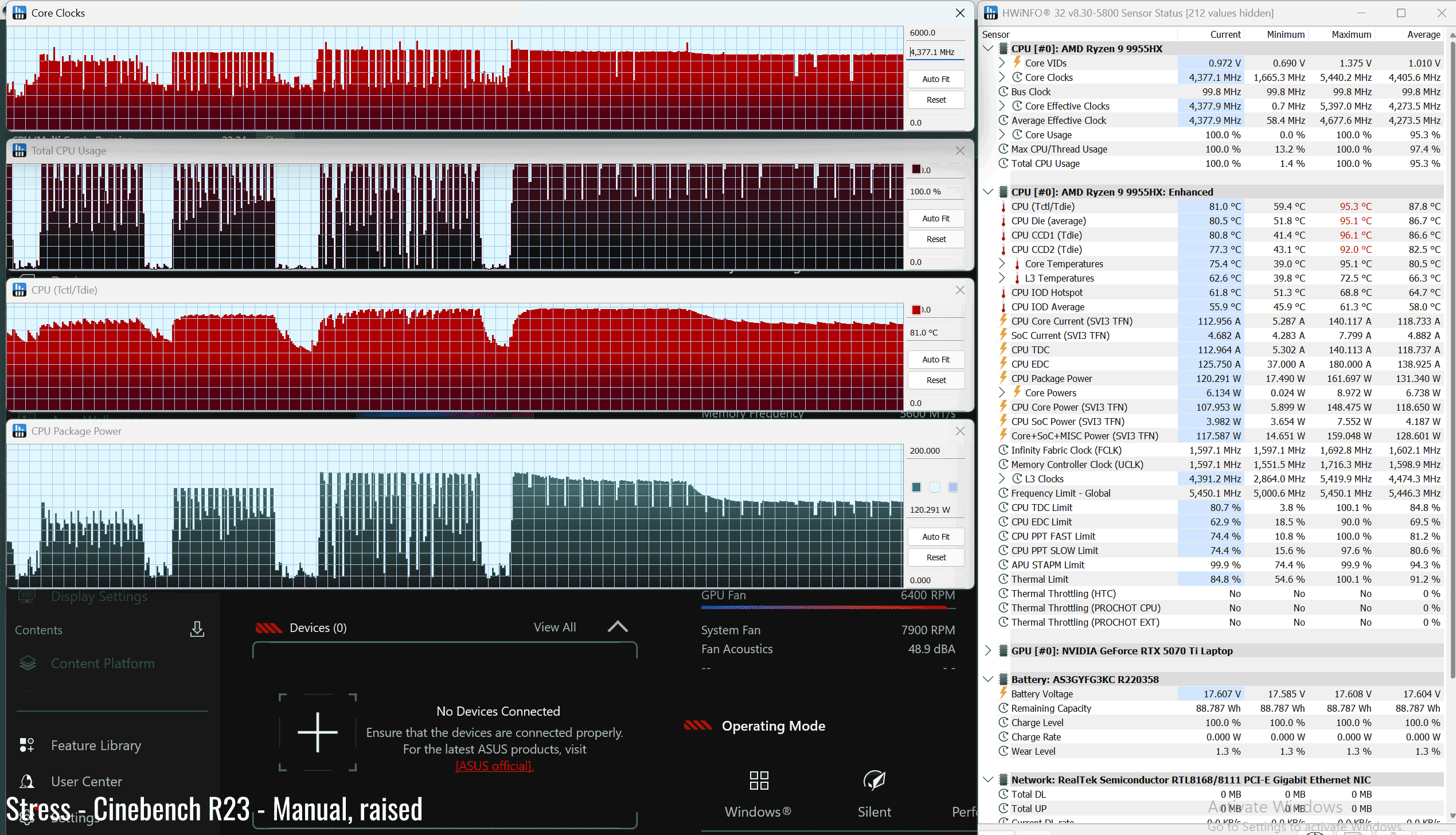 Now, as shown in the previous section, this cooling module handles the Ryzen 9 + RTX 5070Ti 140W configuration fine, without any throttling or other thermal issues. However, running demanding loads with the laptop flat on the desk can lead to high internal temperatures, especially on the GPU; that’s why I recommend raising the back of the laptop off the desk; in this case, temperatures are perfectly fine, usually under 80 degrees Celsius.