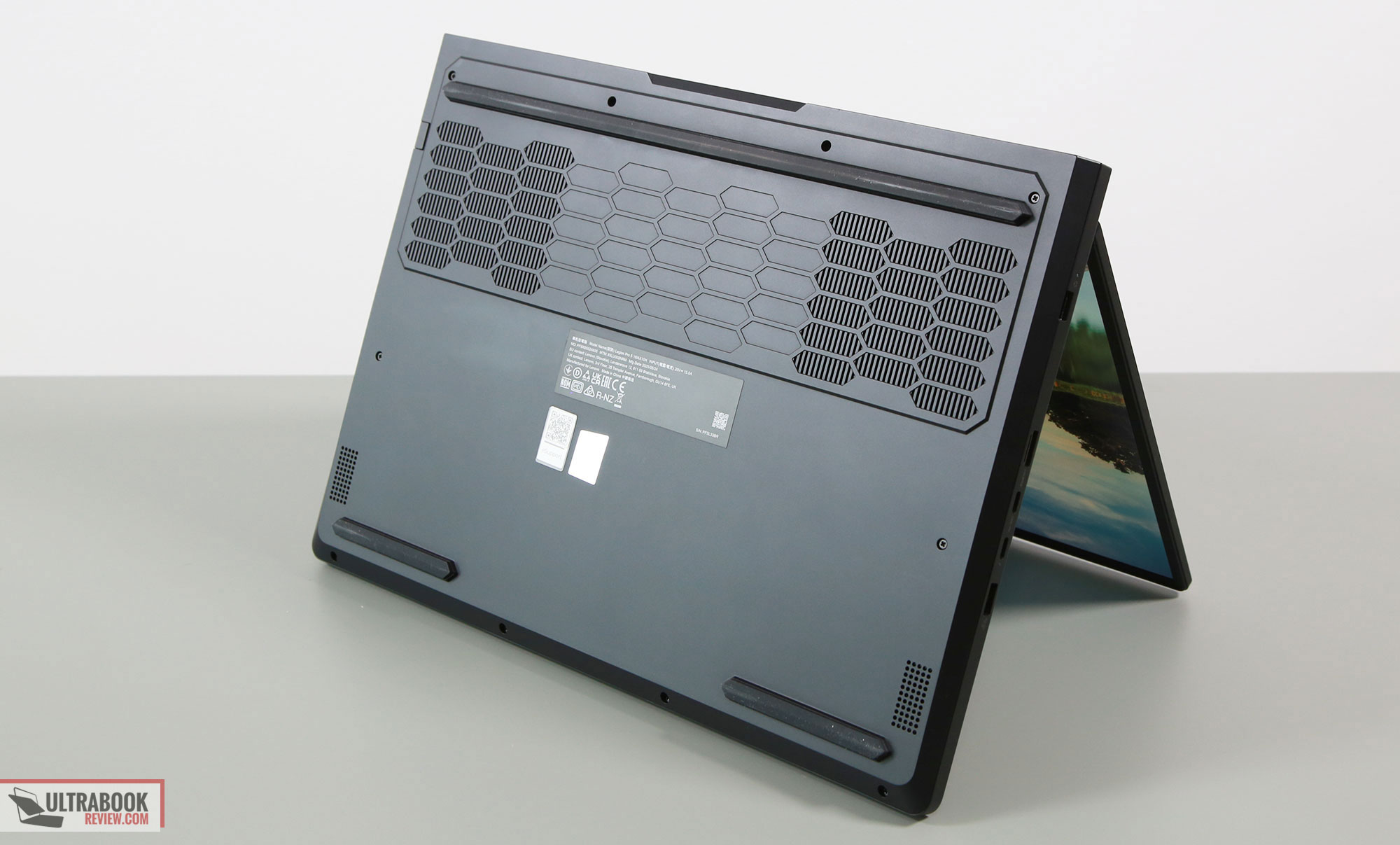 Despite all the plastics, this feels well-built and pleasant to the touch, with the soft, smooth surfaces. All these black elements smudge easily, though, especially the metal lid, so you’ll have to wipe them clean quite often. The past gray Legion Pro 5i variants were a little friendlier in that regard, but this new black design is more professional-looking. They could have muted the LEGION branding on the back jump, though.