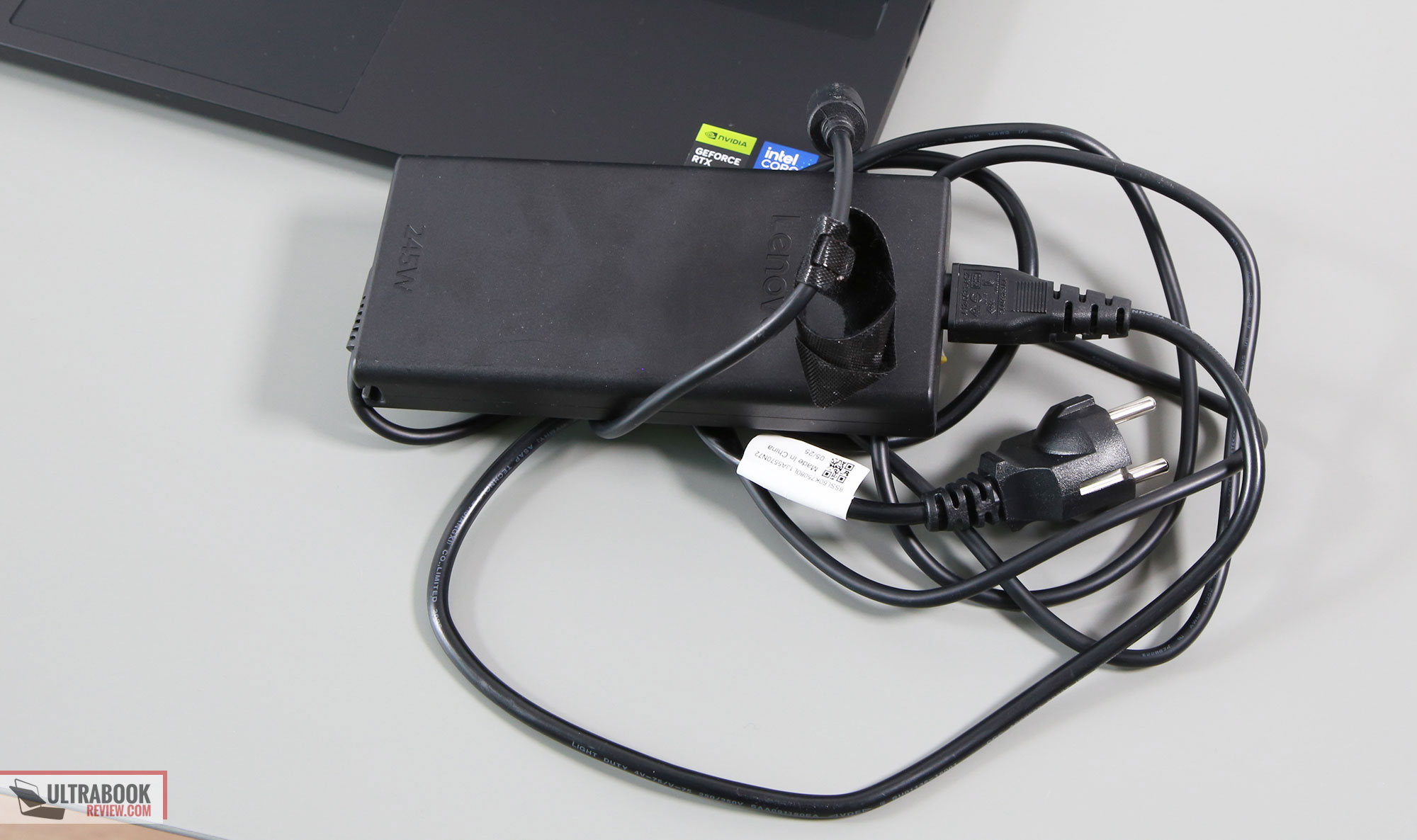Lenovo pairs this configuration with a 300W charger, a dual-piece design with long cables, and a mid-sized power brick. Lower-specced models get a slightly smaller 245W charger. The laptop also supports PD via the USB-C ports on the left edge, at up to 100W.