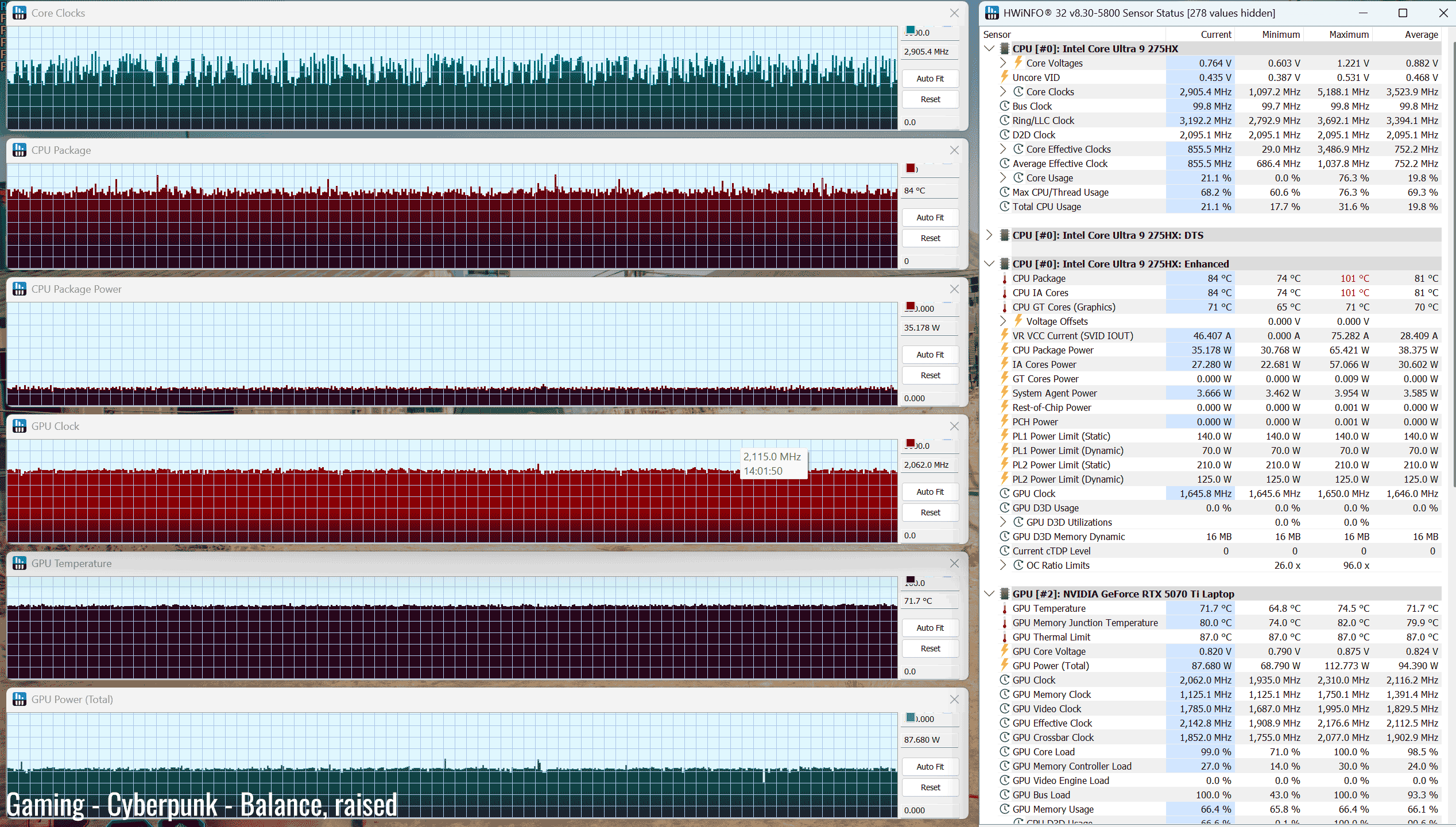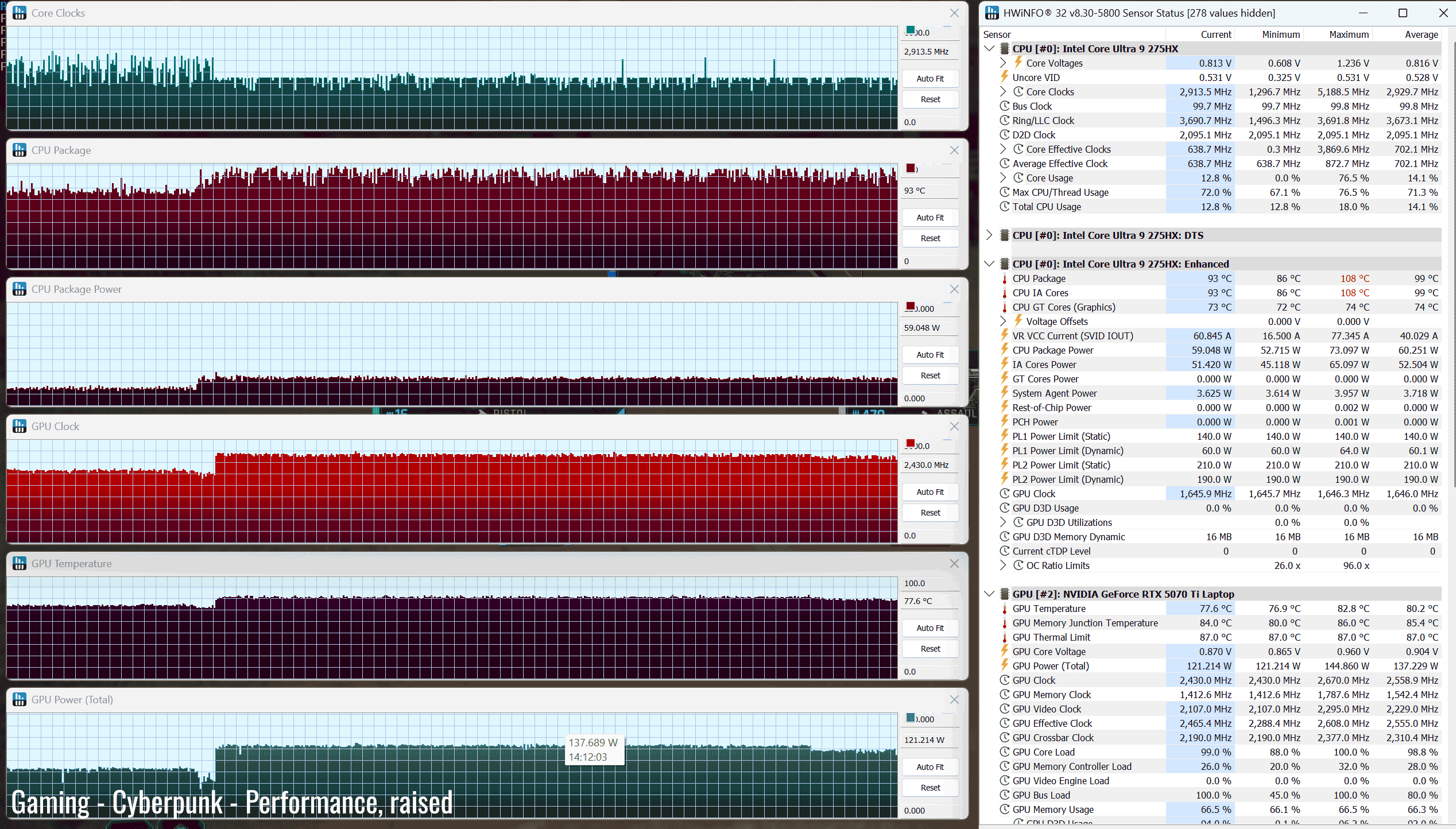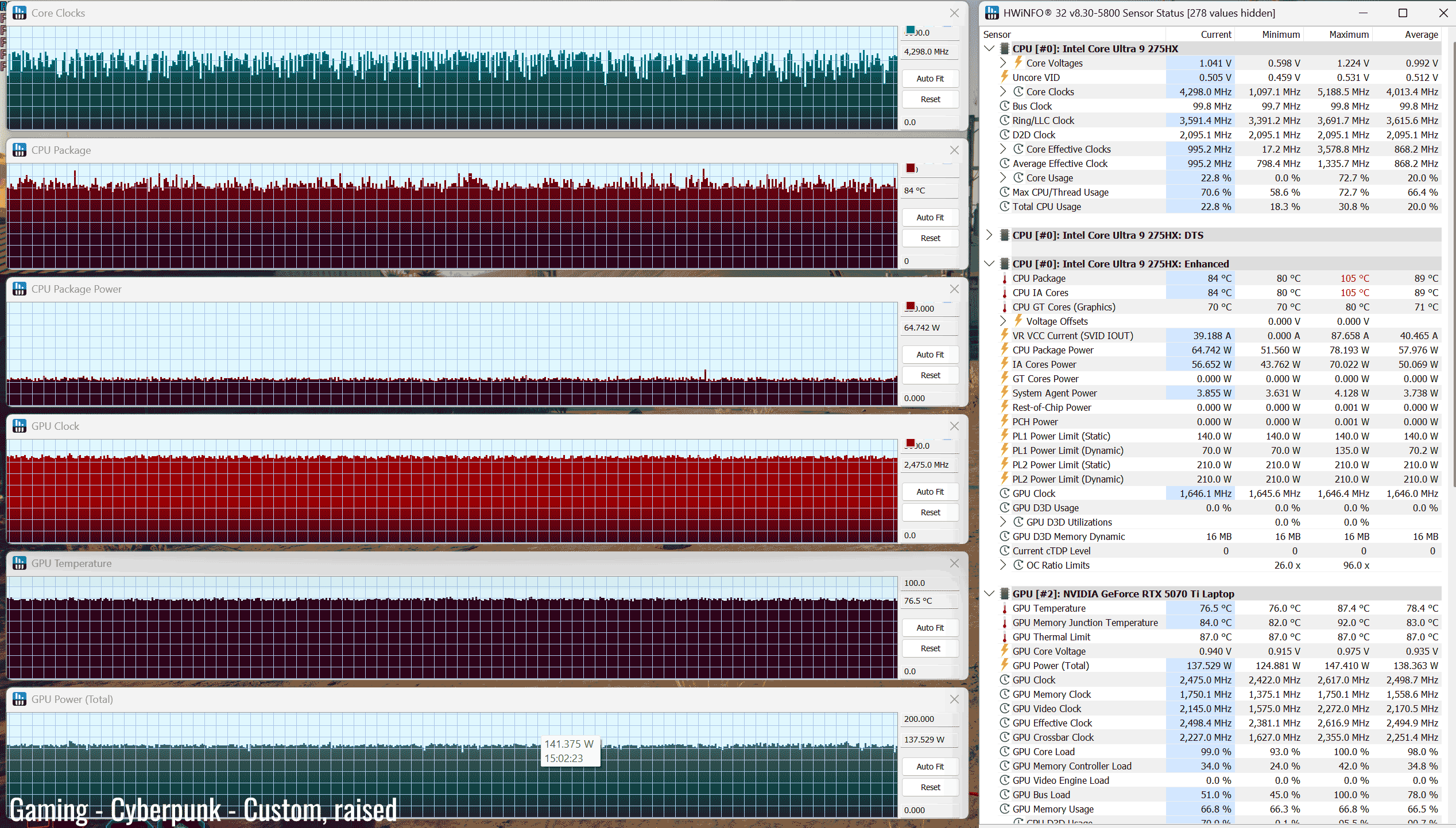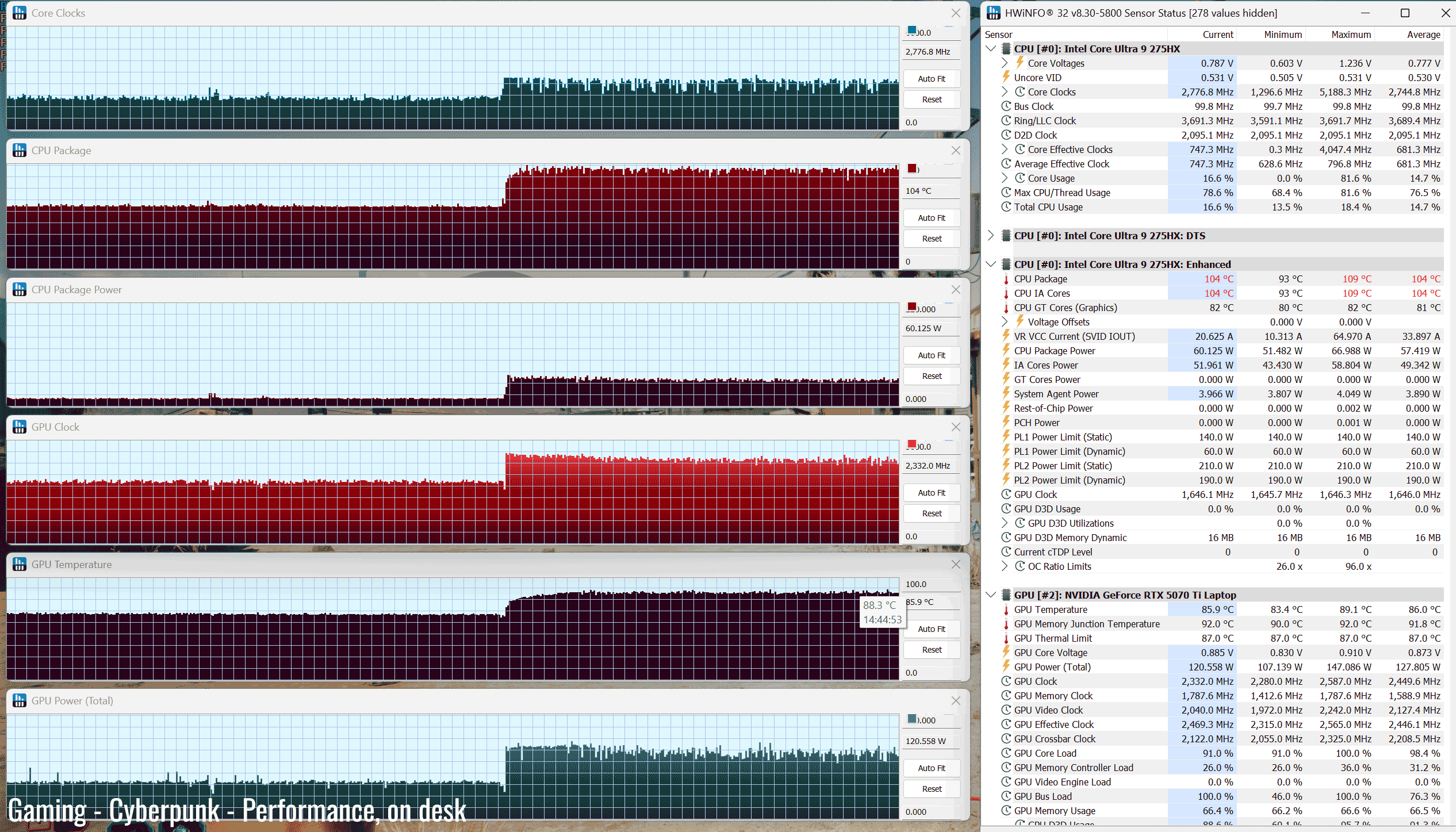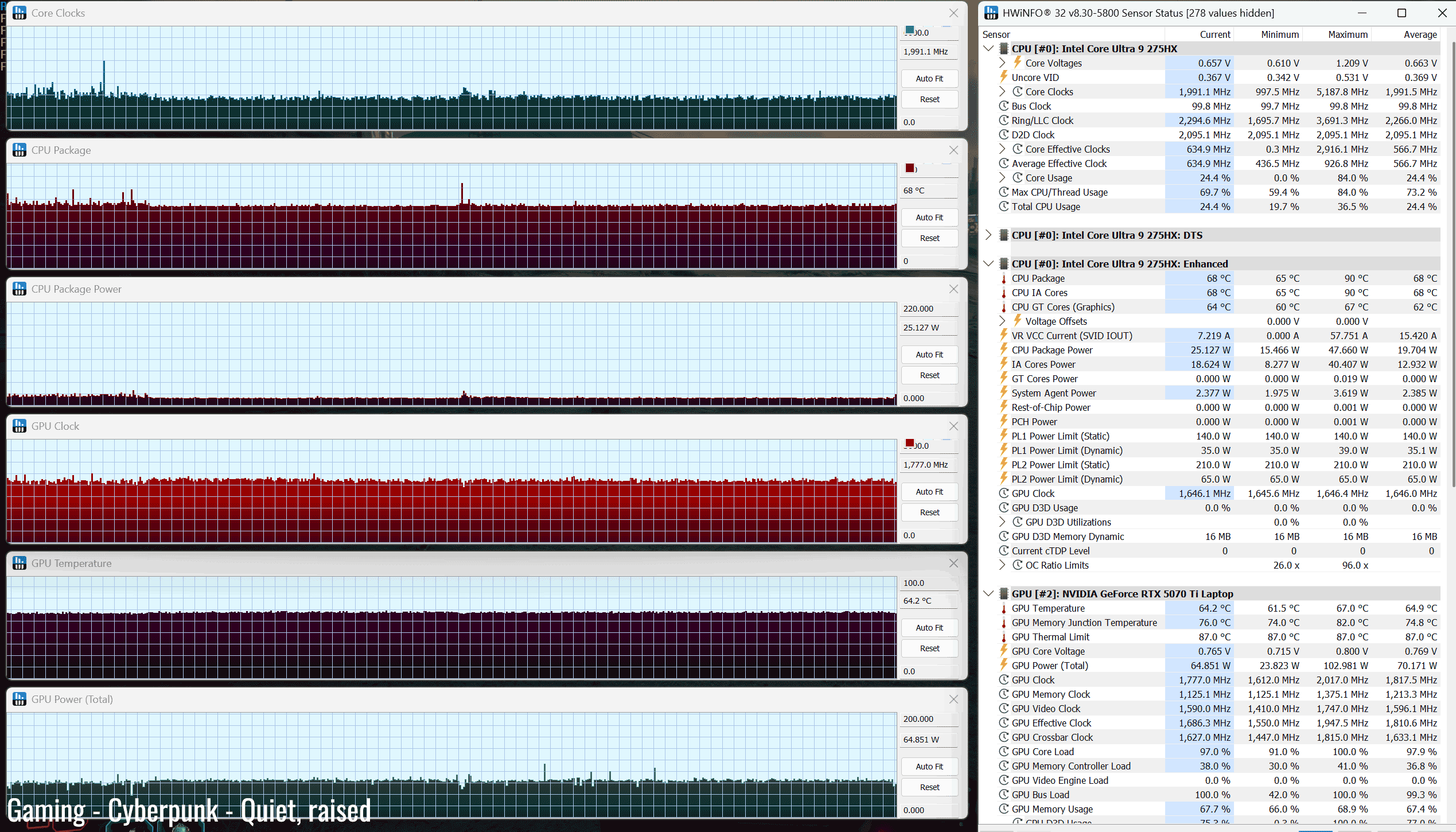*Gaming – Performance on stand– playing Cyberpunk for 30 minutes, fans at ~48 dB