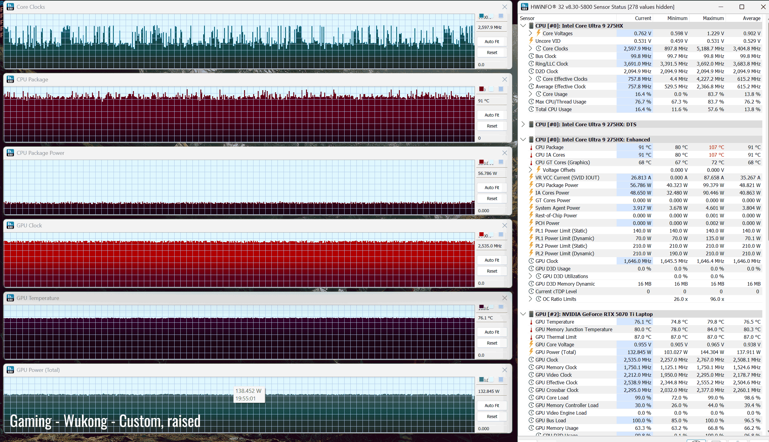 The behaviour changes drastically when bumping the laptop off the desk, though. In this case, the CPU runs at around 88-90 °C and the GPU at 78-80 °C, but at the same time at higher power and clocks for both. In this case, the components are no longer thermally limiting, and the GPU runs at its designed 135-140W TGP.
