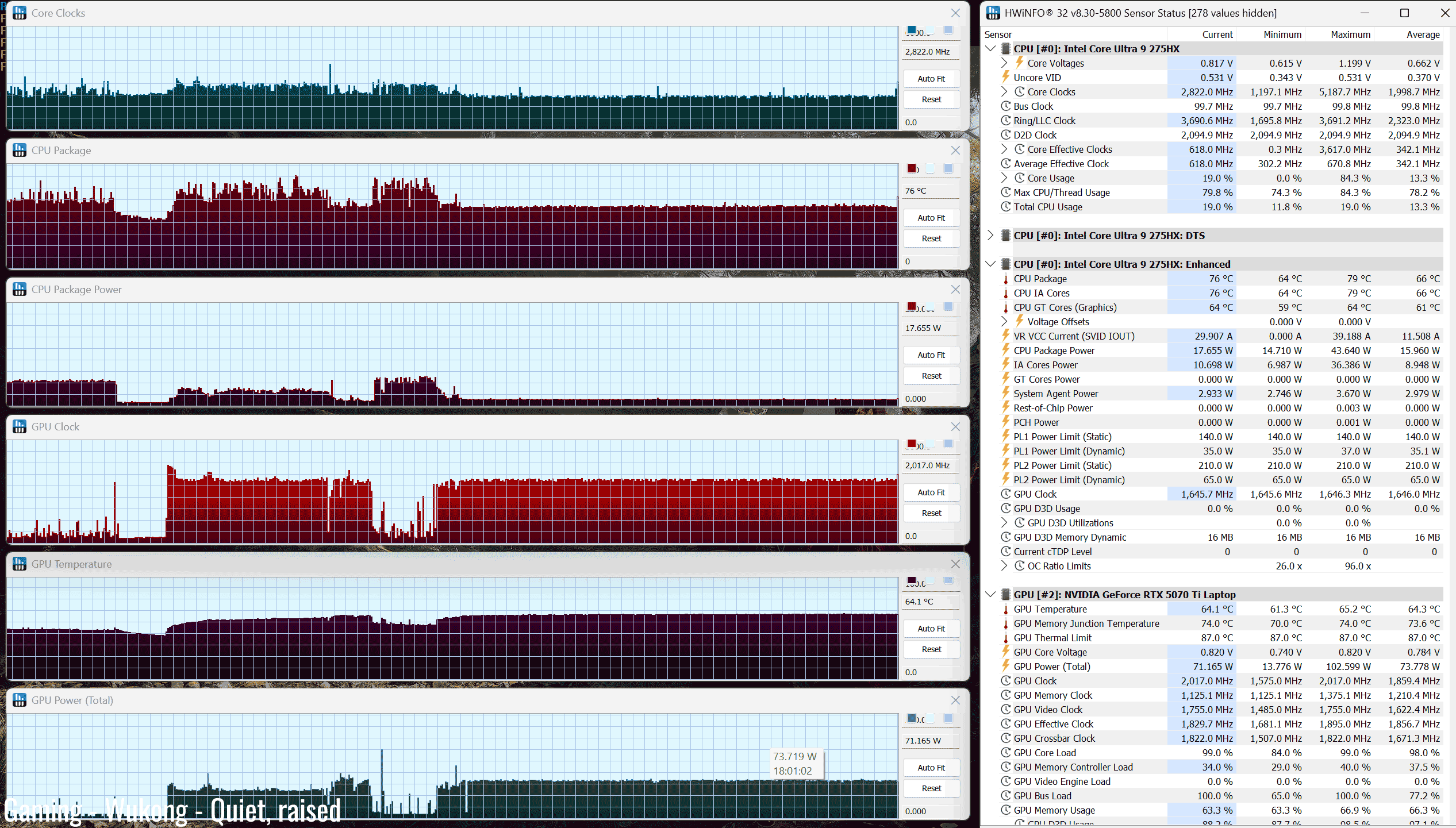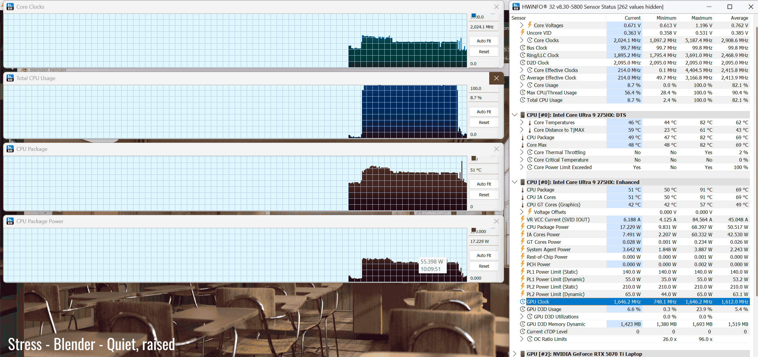 Finally, Quiet mode caps the GPU more aggressively to only about 55W TGP, and that impacts the framerates more significantly. However, the laptop keeps much quieter on this profile, at sub 35 dBA, with CPU/GPU temperatures in the 60s °C.