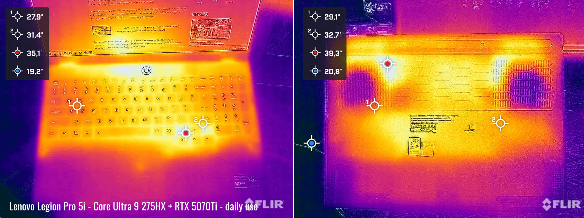 Chassis temperatures stay generally low, but the warmest spot is around the arrows keys, which isn’t great. But at least the surfaces won’t go over 35-38 °C.