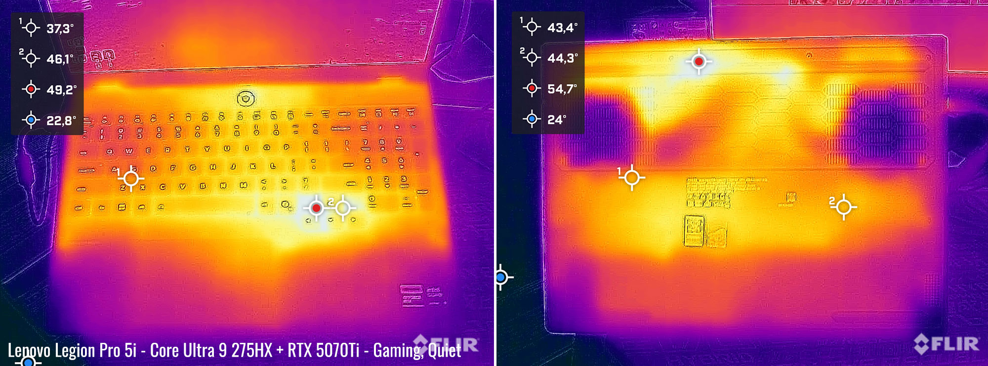 Playing games in Quiet mode keeps the surface temperatures a little lower, but with a similar hotspot in the same place.