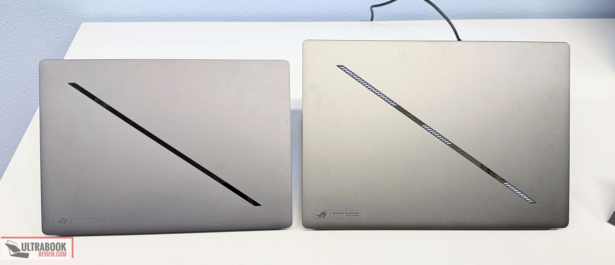 Aesthetically, Asus are offering the two in either a lighter gray or a darker-gray variant. Both have this Slash Lighting bar of LEDs on the lid, with the 2026 generation offering an updated implementation with more control zones (the same number of LEDs, but each controlled individually now, while in the past they could only be controlled in groups). I still wish they had gotten rid of it entirely; the lid would look much cleaner in a simpler design, as it does on the ProArt P16, which is the same chassis but in an all-black minimalist approach. Regardless, it is what it is.