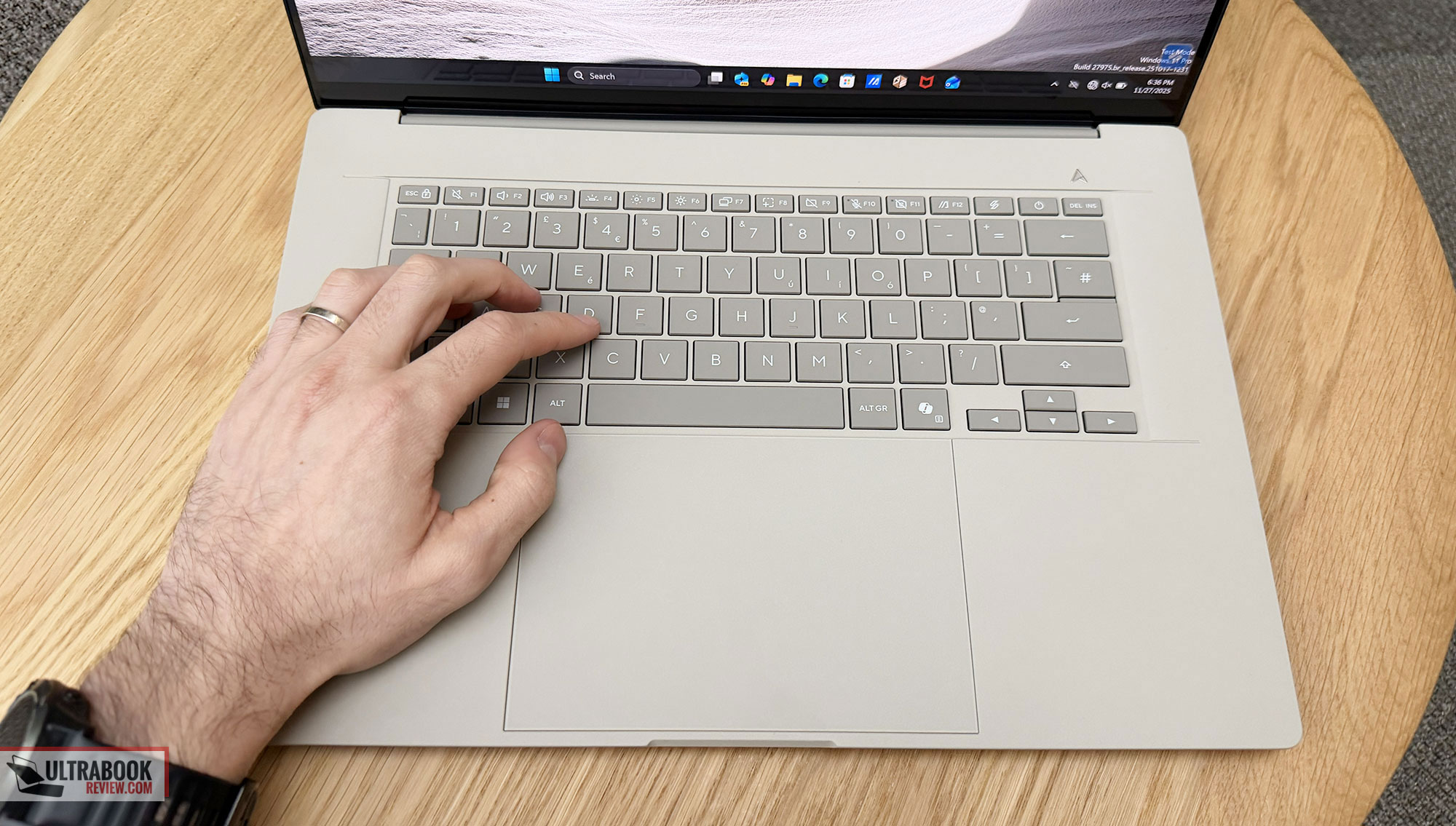 The lateral space around the keyboard doesn’t include any speaker grills of any kind in the Zenbook A16, even if this model actually incorporates larger speakers and a set of extra tweeters, so the audio quality is improved over the 14-inch variant, where the sound quality is rather meh by today’s standards.
